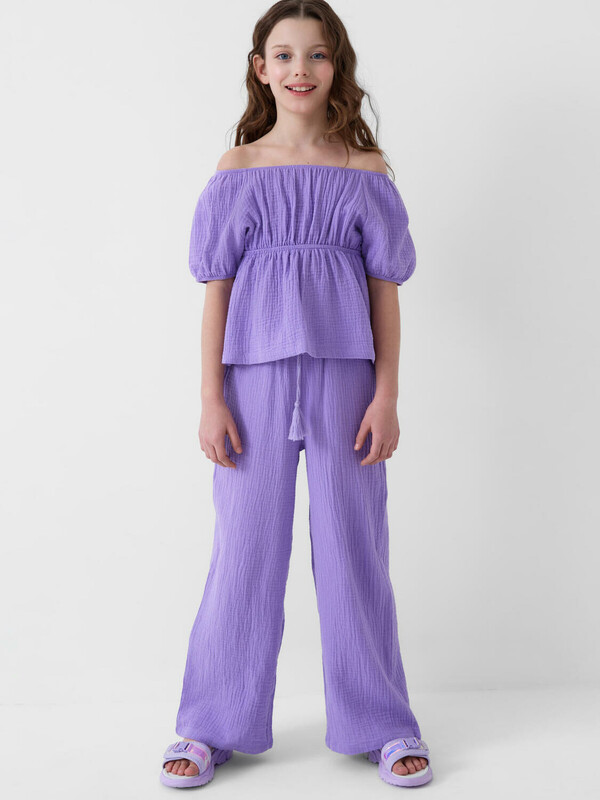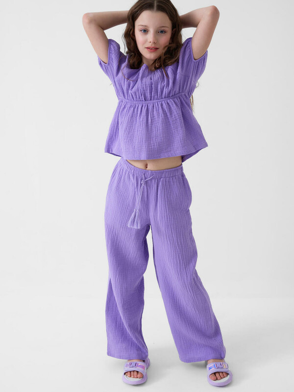 Легкий летний комплект для девочки подростка. Состоит из укороченной блузки и широких брюк. Материал – мягкий хлопковый муслин, дышащий и приятный к телу. Блузка с пышными короткими рукавами и сборкой на резинке по талии, что создает аккуратную и женственную форму. Брюки – длинные и свободные, с высокой посадкой и резинкой на поясе. По бокам — удобные карманы.