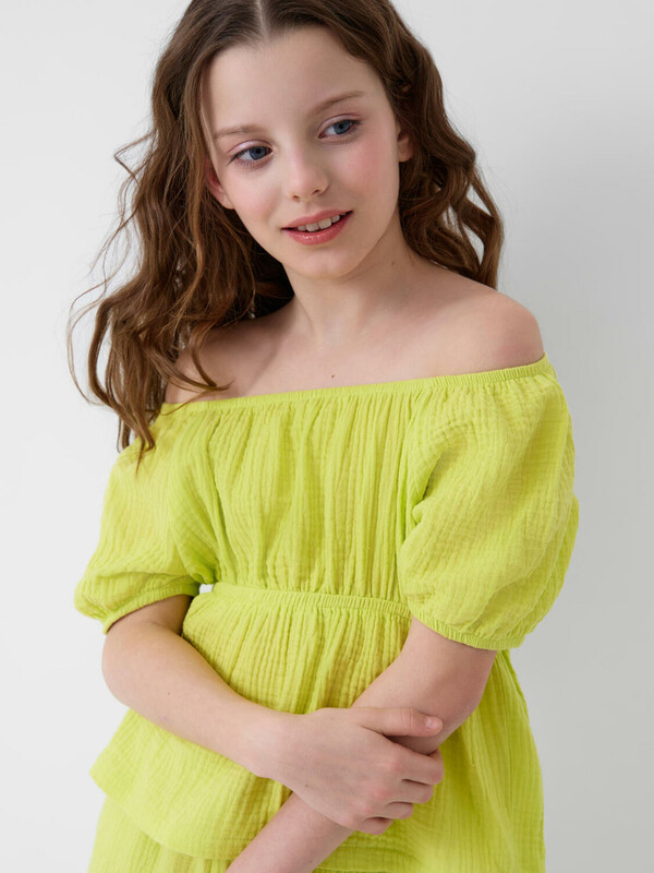 Легкий летний комплект для девочки подростка. Состоит из укороченной блузки и широких брюк. Материал – мягкий хлопковый муслин, дышащий и приятный к телу. Блузка с пышными короткими рукавами и сборкой на резинке по талии, что создает аккуратную и женственную форму. Брюки – длинные и свободные, с высокой посадкой и резинкой на поясе. По бокам — удобные карманы.