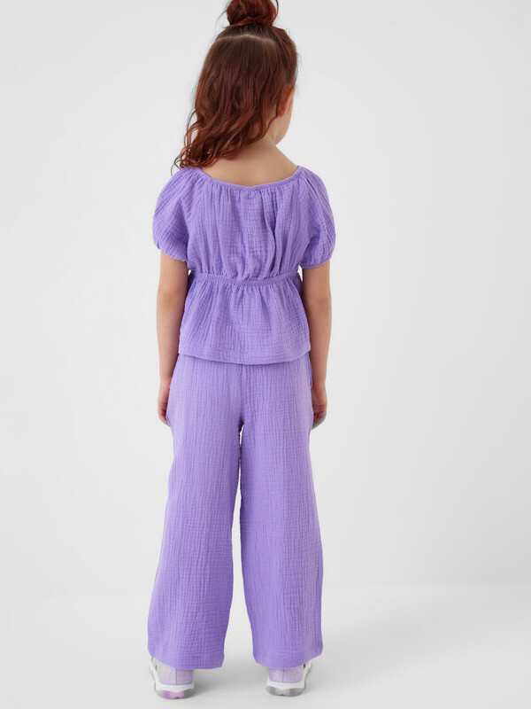 Легкий летний детский комплект для девочки. Состоит из укороченной блузки и широких брюк. Материал – мягкий хлопковый муслин, дышащий и приятный к телу. Блузка с пышными короткими рукавами и сборкой на резинке по талии, что создает аккуратную и женственную форму. Брюки – длинные и свободные, с высокой посадкой и резинкой на поясе. По бокам — удобные карманы.