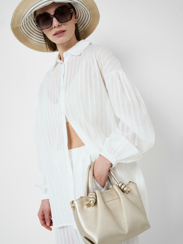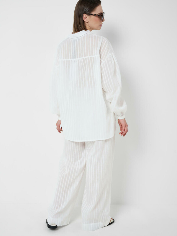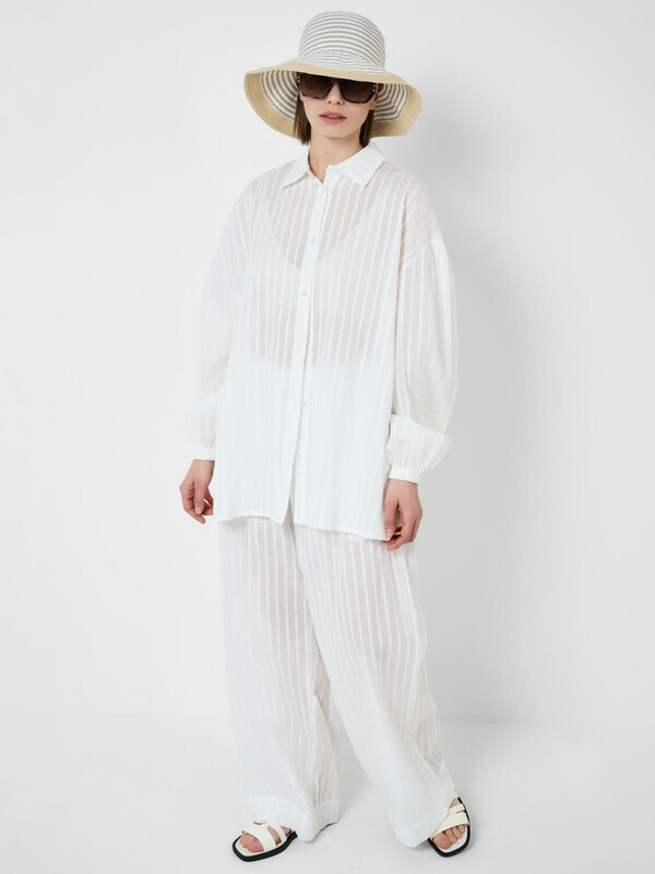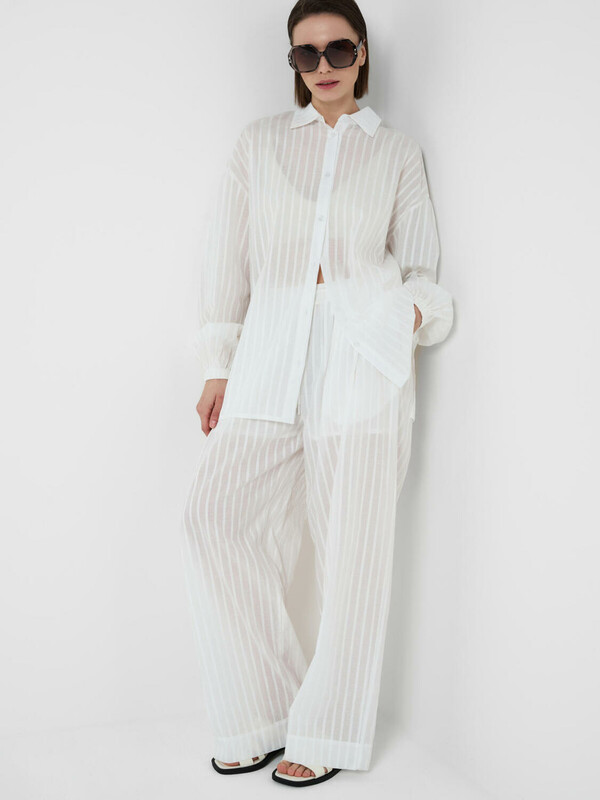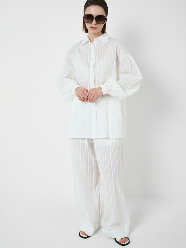 Легкий женский хлопковый костюм. Рубашка свободного прямого кроя с застежкой на пуговицы. Классический воротник и разрезы по бокам. Манжеты на резинке. Широкие брюки палаццо на резинке со шнурком для регулировки. Удобные боковые карманы.