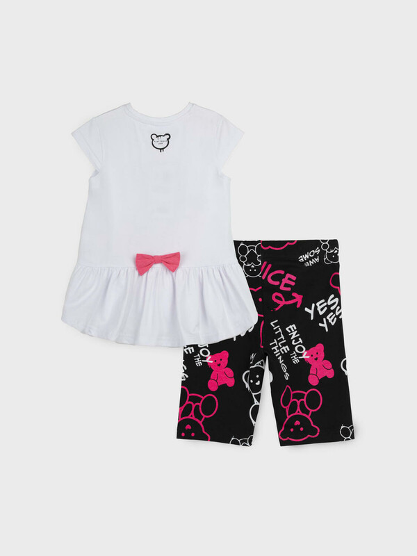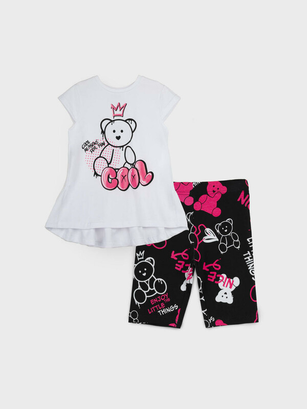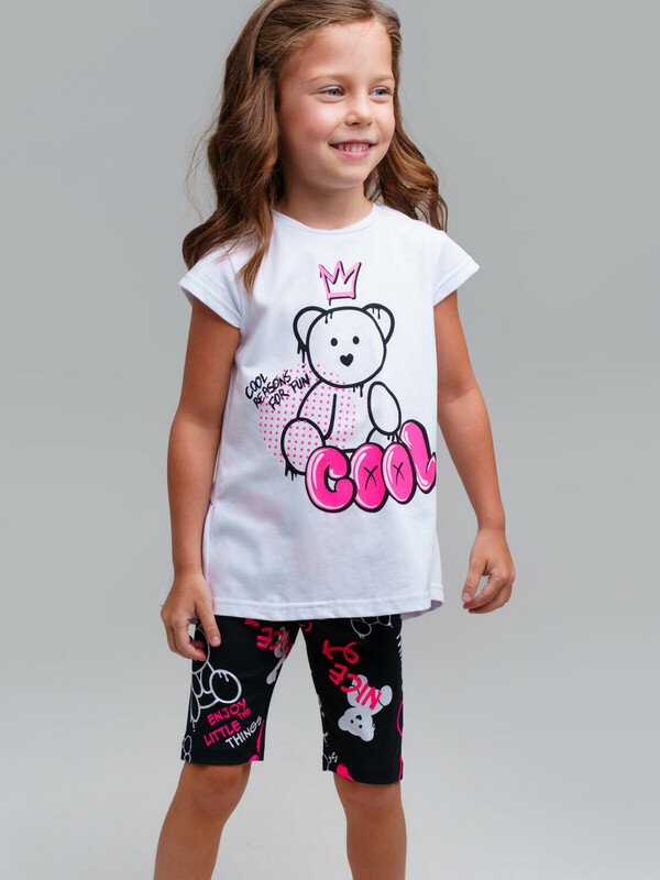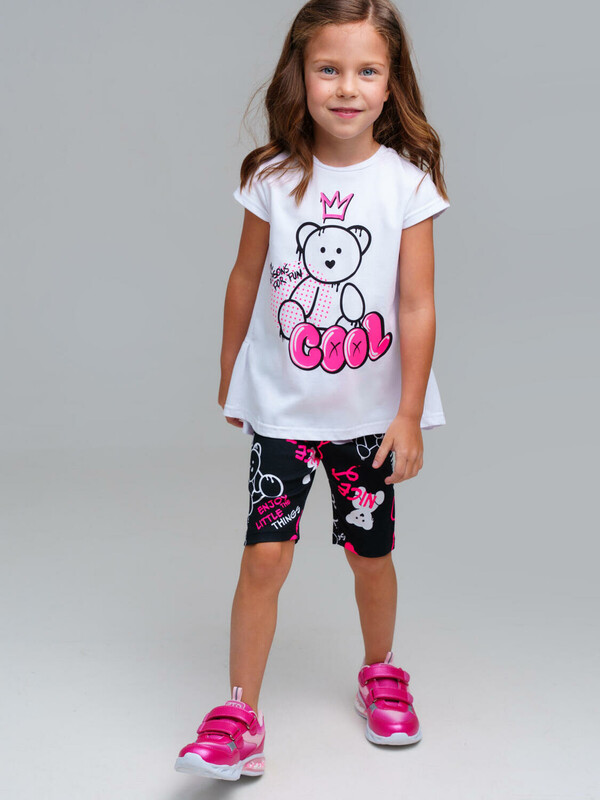 Костюм детский для девочки. Футболка, укороченные леггинсы из эластичного и приятного на ощупь трикотажа джерси. Леггинсы на резинке. Высокое содержание хлопка 95%. Благодаря наличию эластана в составе ткани изделие держит форму и меньше мнется. Модель выполнена из качественного и приятного на ощупь трикотажа.