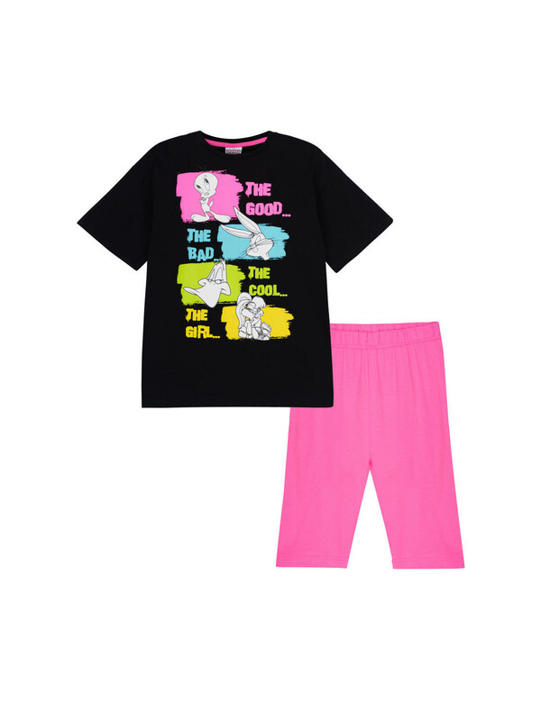 Комплект трикотажный для девочек: брюки (легинсы укороченные), фуфайка (футболка) (146, черный,фуксия)(PlayToday)