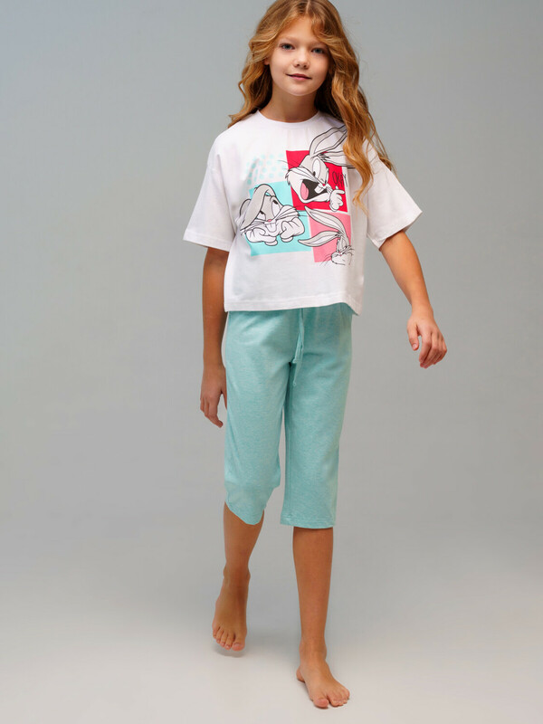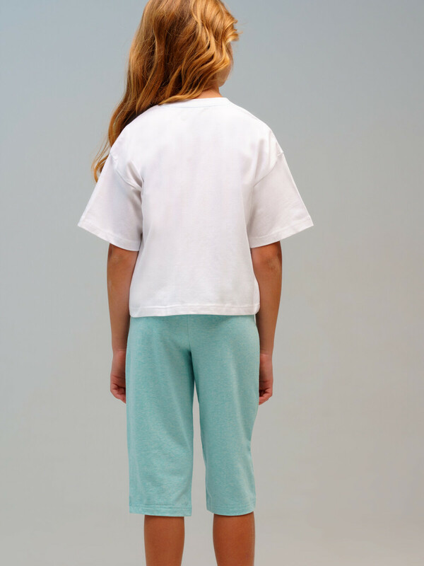 Пижама для девочки подростка. Футболка и капри из эластичного и приятного на ощупь трикотажа. Шорты-капри на резинке со шнурком. Высокое содержание хлопка 95%. Благодаря наличию эластана в составе ткани изделие держит форму и меньше мнется.
