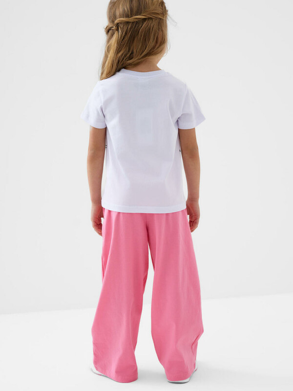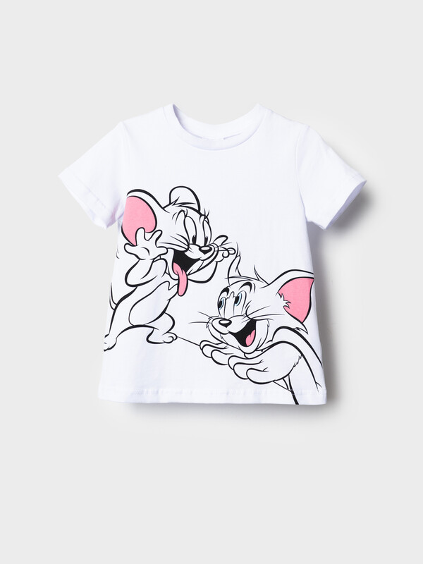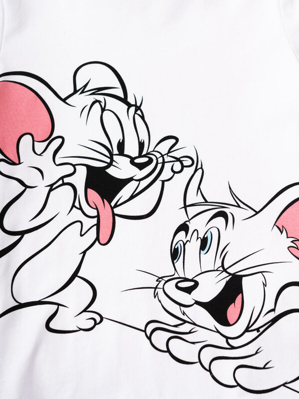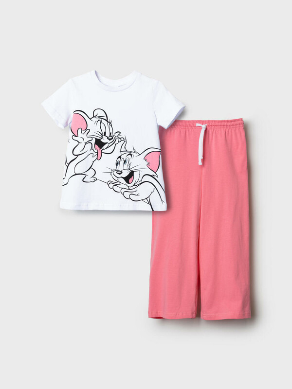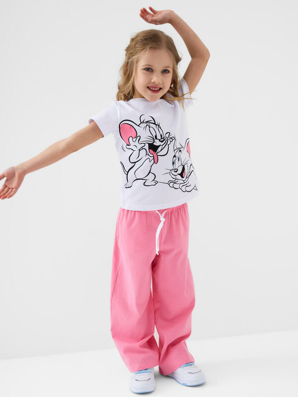 Детский комплект для девочки. Состоит из футболки и широких брюк. Выполнен из хлопкового трикотажа. Футболка прямого силуэта, с короткими рукавами. Украшена крупным красочным принтом с любимыми мультяшными персонажами "Том и Джерри". Брюки — широкие, со средней посадкой. Штаны с эластичным поясом и шнурком для регулировки. Удобные боковые карманы.