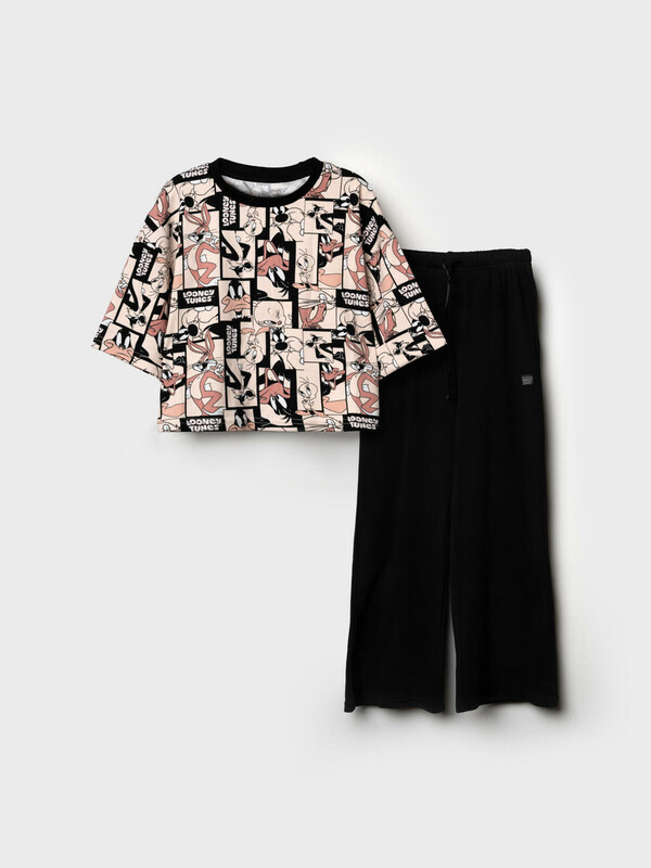 Комплект трикотажный для девочек: фуфайка (футболка), брюки (140, бежевый,черный)(PlayToday)