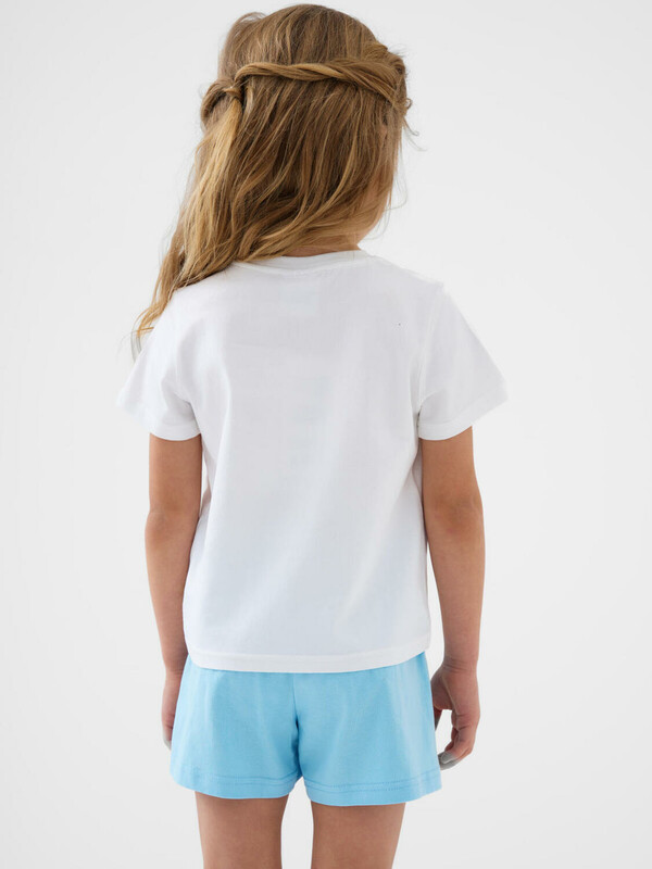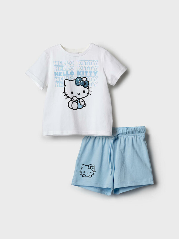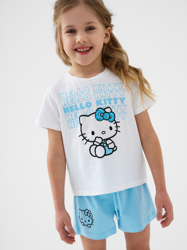 Детский костюм для девочки. Состоит из футболки и шорт. Выполнен из хлопкового трикотажа. Футболка прямого кроя, с коротким рукавом. Яркий принт с любимым персонажем "Hello Kitty". Шорты свободные, с эластичным поясом и шнурком для регулировки посадки.