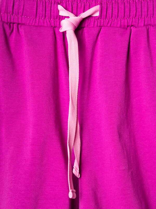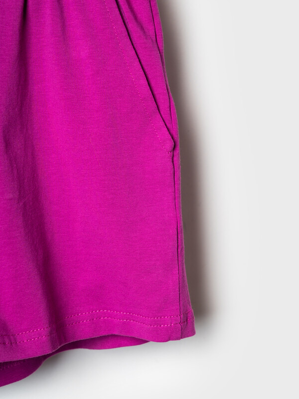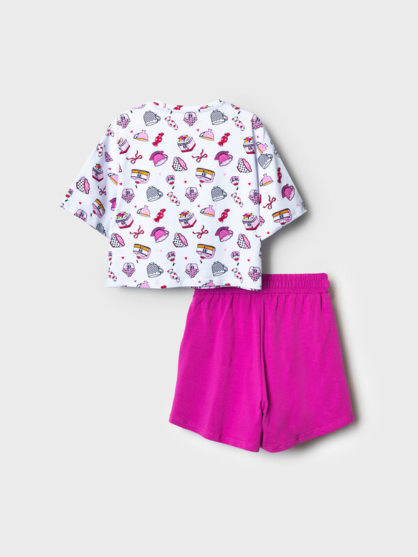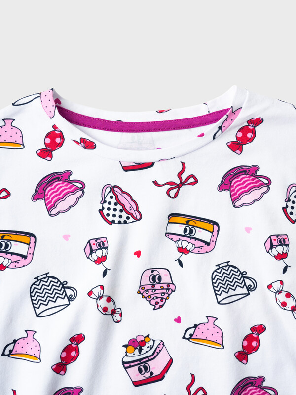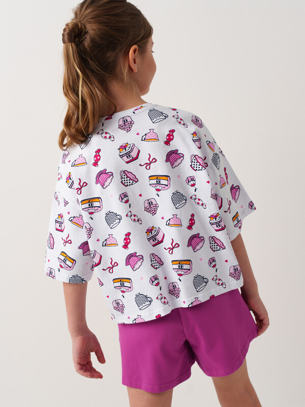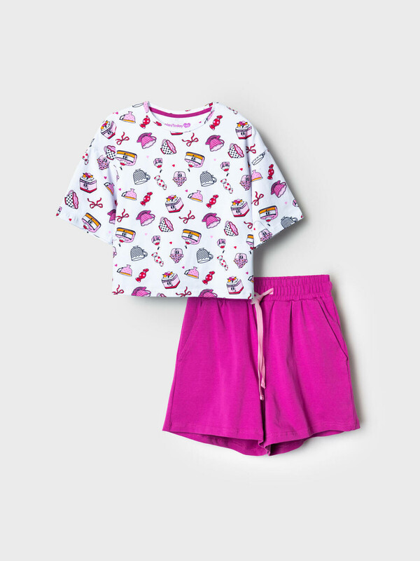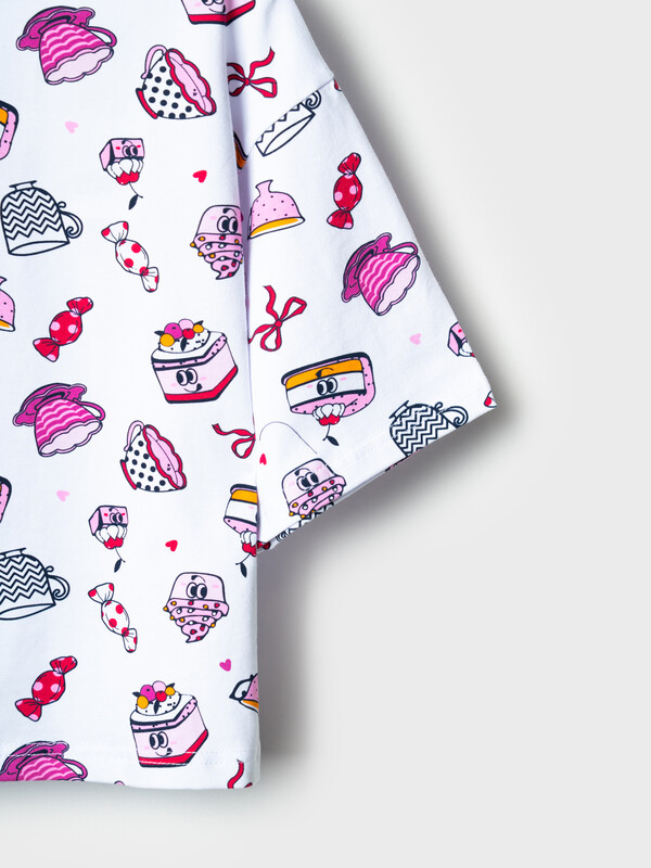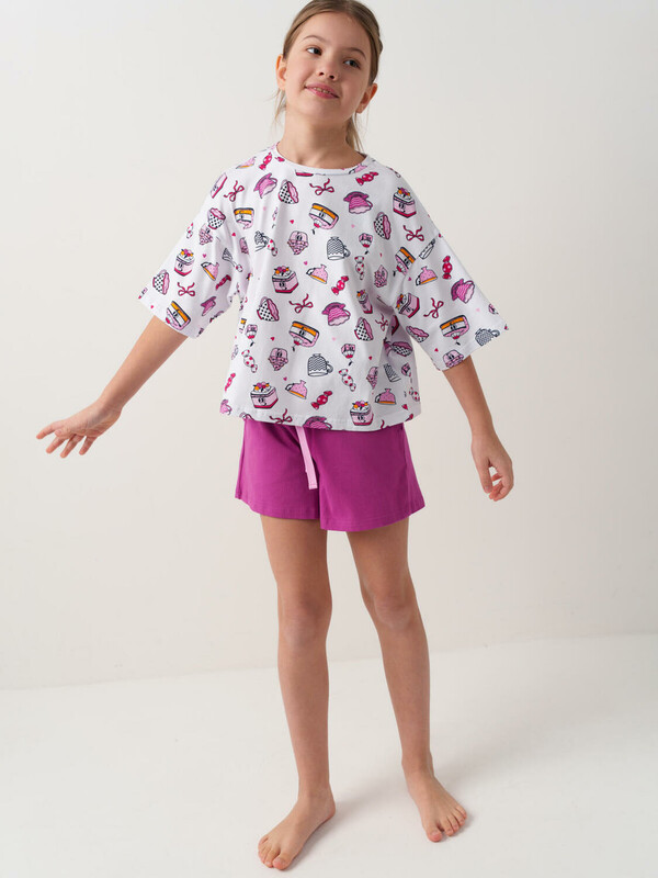 Пижама для девочки подростка. Состоит из оверсайз футболки с короткими рукавами и удобных шорт. Футболка украшена ярким принтом с милыми десертами, чашками и конфетами. Шорты однотонные с мягким поясом и декоративным шнурком. У шорт есть карманы. Комплект выполнен из мягкого, хлопкового трикотажа, приятного к телу.