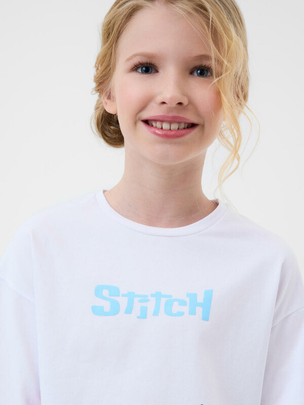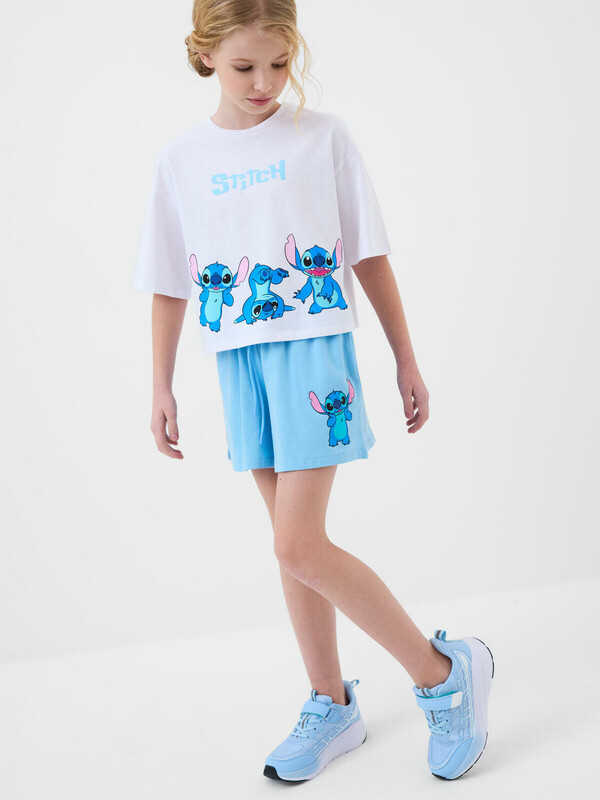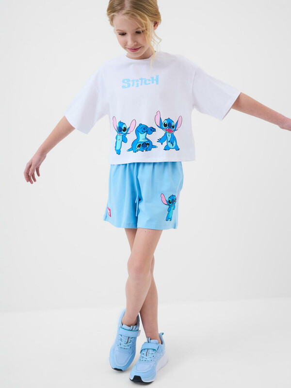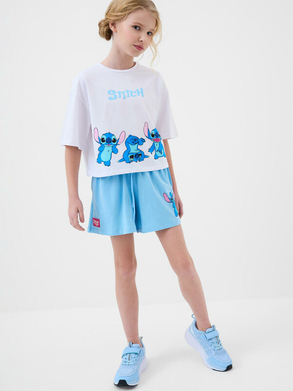 Стильный костюм для девочки подростка. Состоит из футболки с коротким рукавом и шорт. Выполнен из хлопкового трикотажа. Футболка оверсайз с красочным принтом любимого мультяшного персонажа "Лило и Стич". Шорты свободные, короткие, хорошо сидят на талии благодаря эластичному поясу и регулирующему шнурку. Удобные боковые карманы.