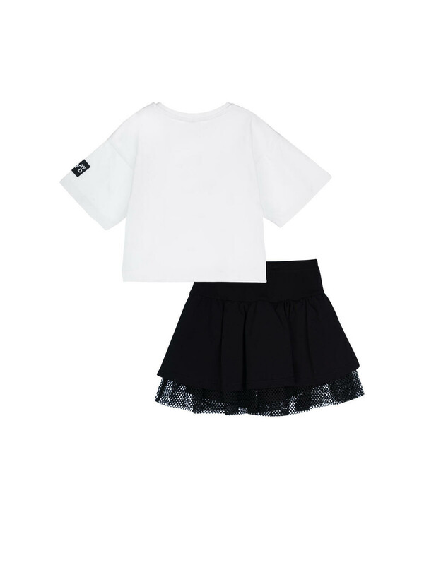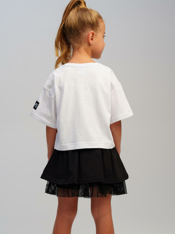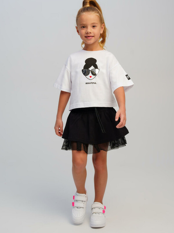Костюм детский для девочки.Футболка и юбка-шорты классической посадки. Костюм из качественного и приятного на ощупь трикотажа джерси с высоким содержанием хлопка 95%. Благодаря наличию эластана в составе ткани изделие проще в уходе и держит форму. Юбка шорты на резинке. Декор из сетки. Модель выполнена из качественного и приятного на ощупь трикотажа.