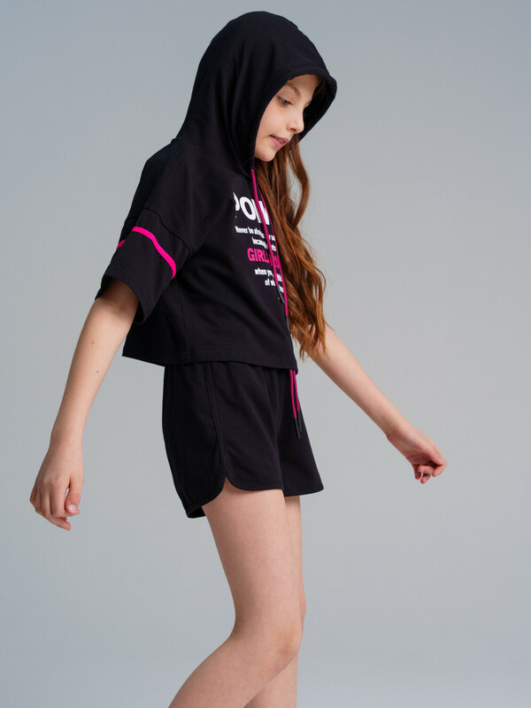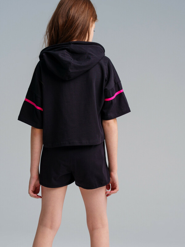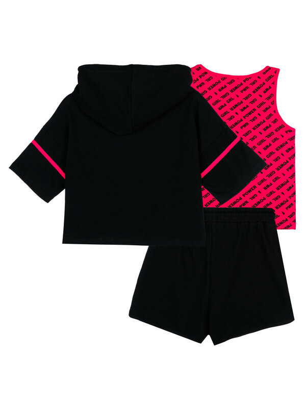 Комплект: футболка, майка, шорты из качественного и приятного на ощупь трикотажа джерси. Высокое содержание хлопка 95%. Благодаря наличию эластана в составе ткани изделие проще в уходе и держит форму. Футболка свободного кроя с капюшоном. Шорты с эластичным поясом со шнурком.