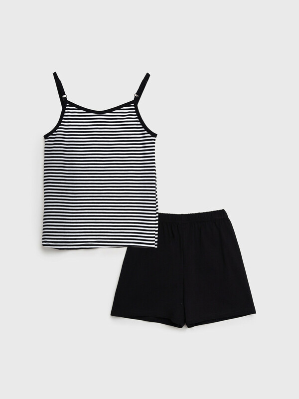 Костюм для девочки подростка. Майка и шорты из эластичного и приятного на ощупь трикотажа. Регулируемые лямки. Шорты на резинке со шнурком. Высокое содержание хлопка 95%. Благодаря наличию эластана в составе ткани изделие держит форму и меньше мнется.