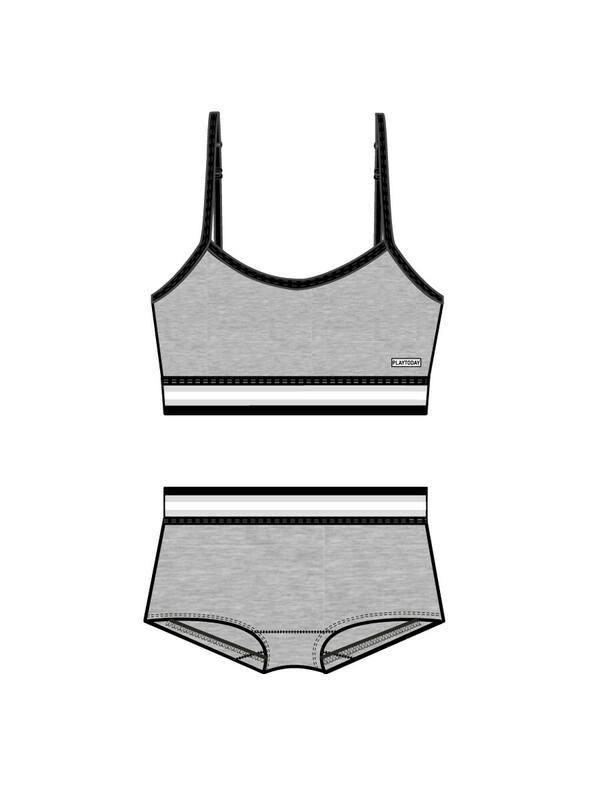 Комплект белья: трусы-шорты и топ со съемными чашками из мягкой трикотажной ткани с добавлением эластана для комфортной носки и свободы движений. Регулируемые бретели. По низу топа и поясу шорт фактурная резинка.