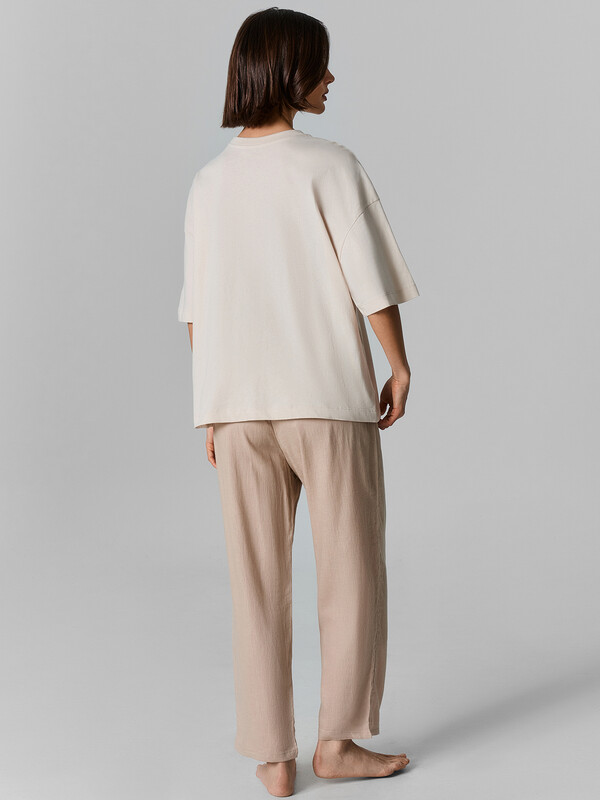 Комплект женский состоит из джемпера и бридж. Джемпер прямой свободный (на базе 112953) из кулирного полотна. Горловина круглая с обтачкой из рибаны. Шов втачивания обтачки по спинке закрыт бейкой из основного полотна. Рукава втачные короткие. Нижние срезы джемпера и рукавов обработаны швом вподгибку. Бриджи прямые, укороченные, слегка зауженные к низу из ткани. Посадка средняя. Пояс цельнокроеный с эластичной тесьмой внутри (внутр.40мм 40RV). С внешней стороны пояса пробиты петли и вставлен шнур-бейка из основного полотна. В боковых швах обработаны карманы. Нижние срезы бридж обработаны швом вподгибку.