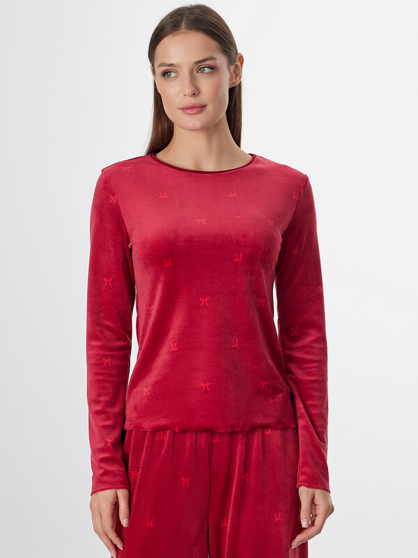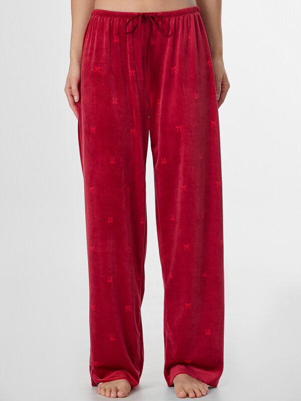 Домашняя пижама из велюра подарит вам ощущение уюта и мягкости. Этот уютный ансамбль состоит из джемпера полуприлегающего силуэта и свободных брюк, созданных для полного расслабления.