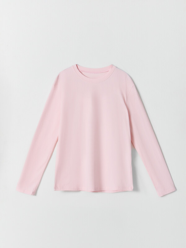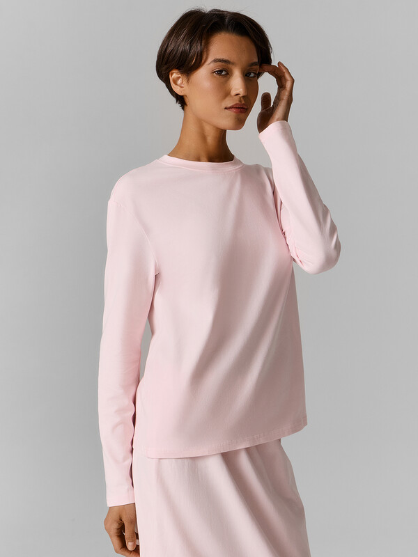 Комплект состоит из лонгслива (122952) и юбки (152809) из кулирного полотна. Лонгслив прямого силуэта. Горловина круглая, обработана обтачкой из основного полотна. Рукава втачные длинные, плечо спущено. Нижний срез изделия и рукавов обработан швом вподгибку.