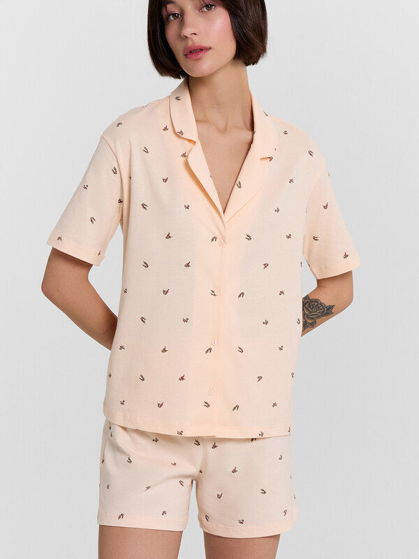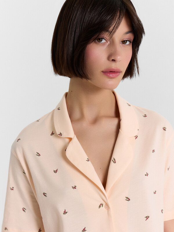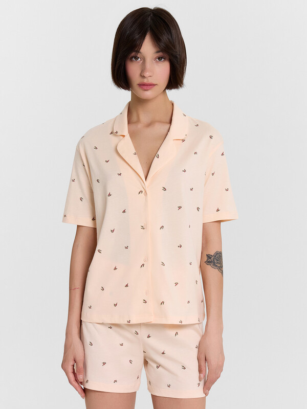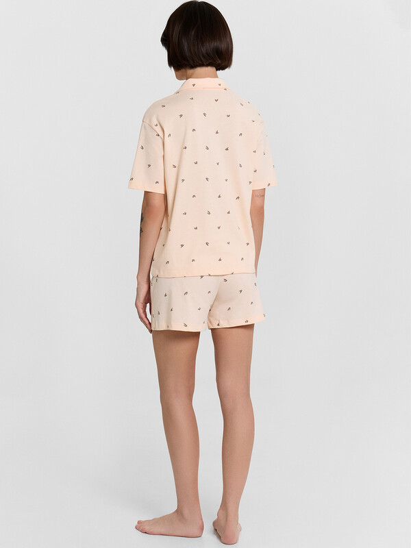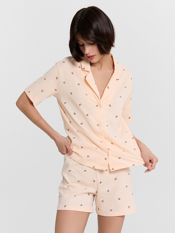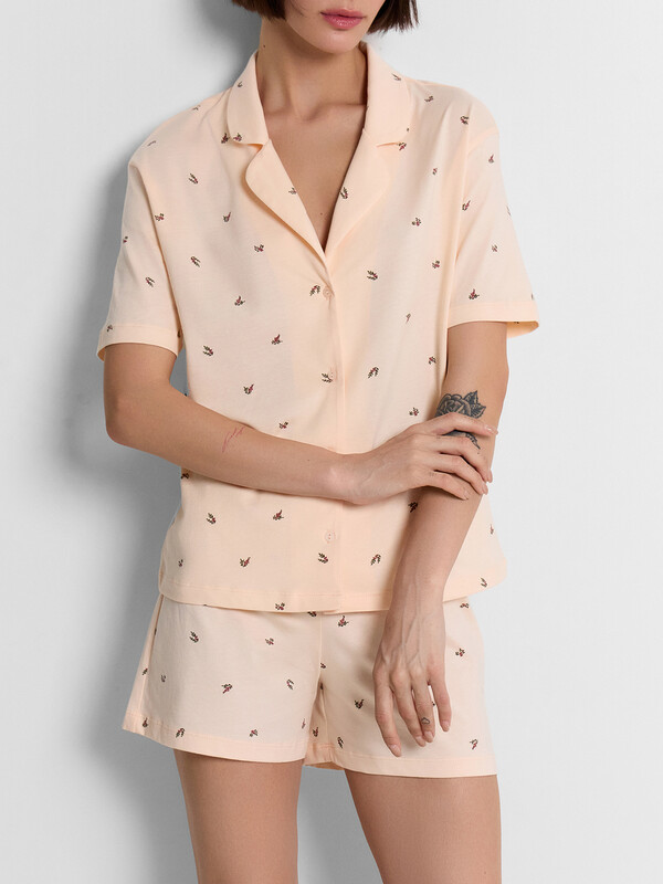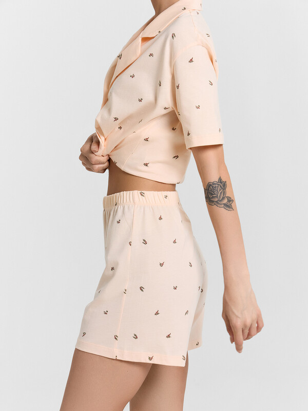 Комплект женский состоит из рубашки и шорт. Рубашка свободного силуэта, с отложным воротником. Рукав втачной короткий, линия плеча немного спущена, рукав обработан вподгибку. Рубашка с центральной застежкой с петлями и пуговицами. Низ застрочен швом в подгибку.