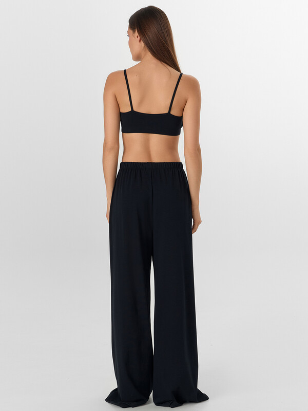 Топ мягко облегает фигуру, повторяя ее линии, а аккуратная обработка низа с эластичной тесьмой обеспечивает комфортную посадку. Брюки с эластичным поясом мягко фиксируются на талии, не создавая давления, и дарят полную свободу движений. Плоские швы и качественная обработка всех краев предотвращают натирание и обеспечивают комфорт.