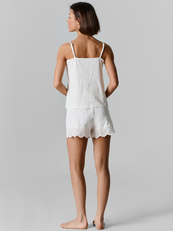 Стильный пижамный комплект, состоящий из топа и шортов. В составе полотна преобладает приятный к телу, натуральный хлопок. Прямой топ на тонких бретелях с V-образной горловиной и декоративной обработкой срезов. Прямые мини-шорты с эластичной тесьмой в поясе. Рекомендуем для дома, сна и расслабленного отдыха!