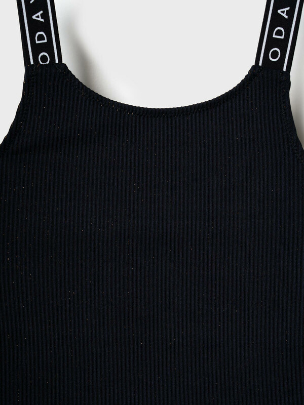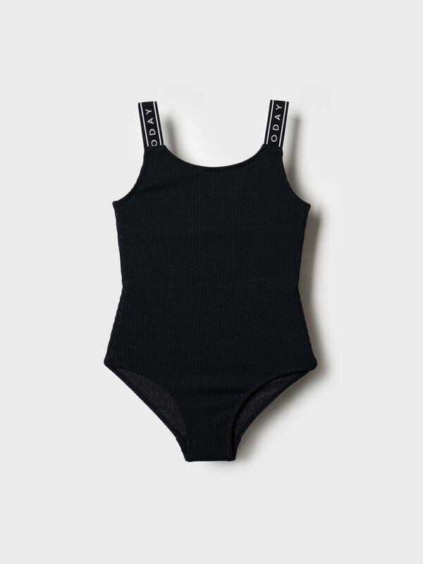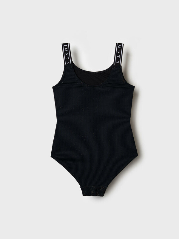 Купальник слитный для девочки подростка. Модель с широкими лямками и классическим кроем, на спине - глубокий вырез. По бокам купальника виден аккуратный контрастный элемент, а широкие бретели украшены надписью "JUST SMILE". Купальник выполнен из черного эластичного трикотажа с вертикальным жаккардовым узором. Со 146 размера предусмотрены мягкие съемные чашки. Внутри предусмотрена подкладка, снизу — хлопковая вставка для комфорта. Края изделия обработаны эластичной тесьмой, чтобы купальник хорошо сидел и не натирал. Благодаря UF-защите, ткань сохраняет первоначальный вид даже при длительном пребывании на солнце. Подходит для активного отдыха и плавания.