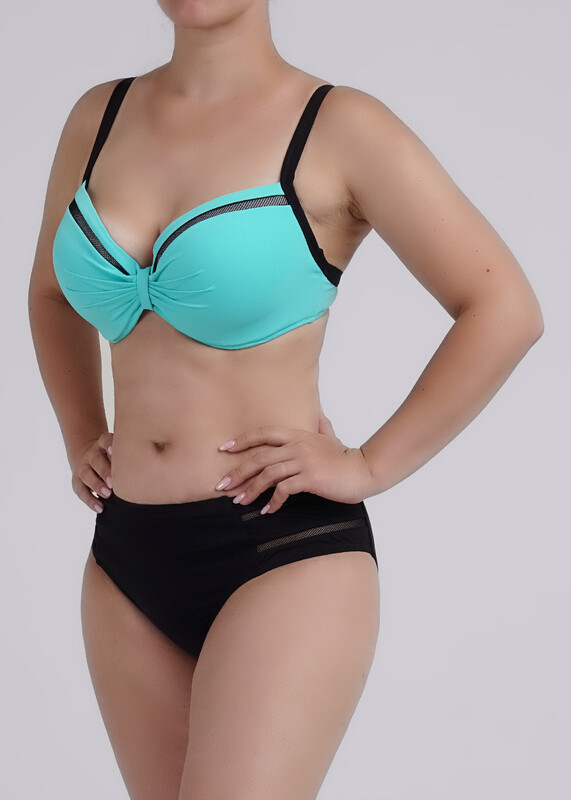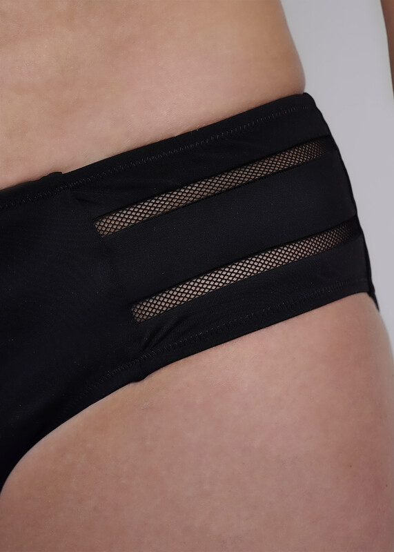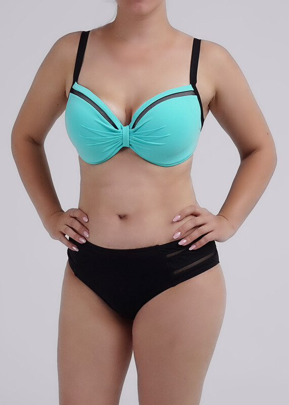 Костюм купальный женский из полиамида с эластаном. Лиф с классическими чашечками, с декоративными элементами спереди, в виде контрастных полос, на регулируемых бретелях. Трусы макси высокой посадки,так же с контрастными элементами.