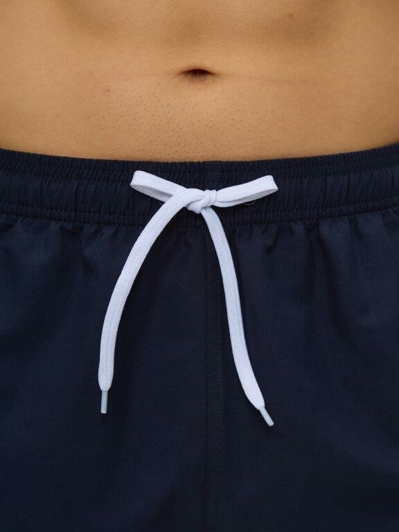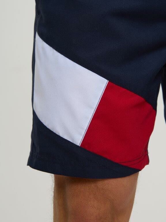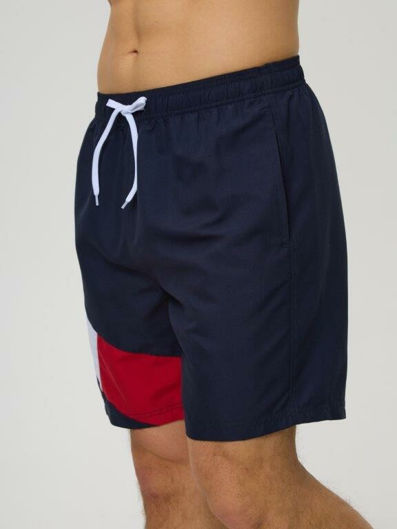Мужские шорты с боковыми караманми из мягкого полотна без эластана. Контрасные вставки двух цветов на правой части шорт. Внутренние плавки из мягкой эластичной сетки. По линии талии широкая резинка и регулируемый шнурок. Подгиб по ни жнему краю шорт.