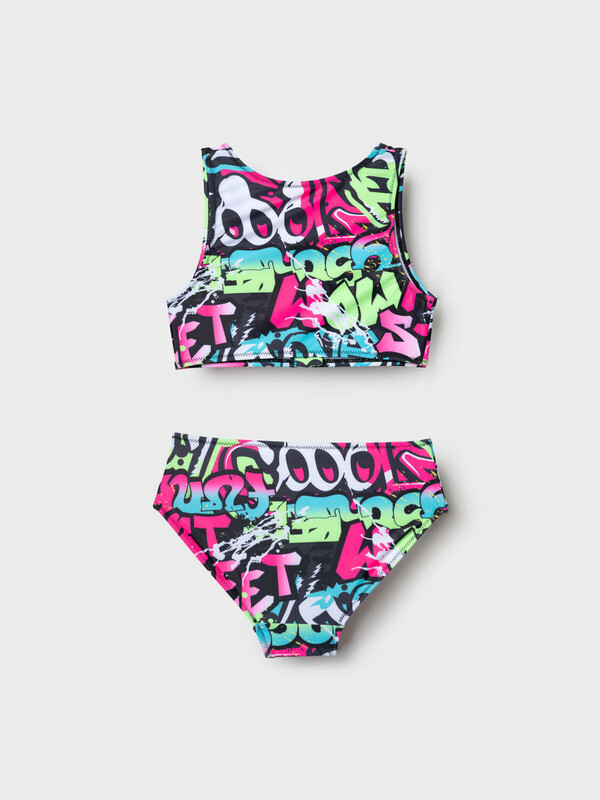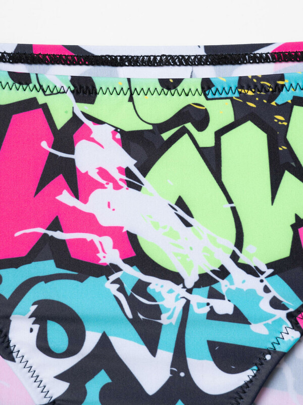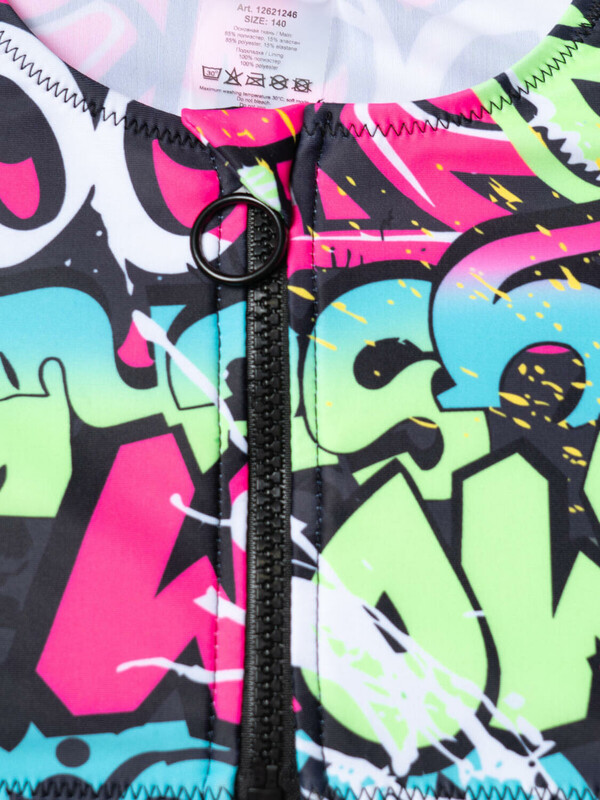 Купальник раздельный для девочки подростка. Верх выполнен в виде короткого топа с удобной застёжкой-молнией спереди, а плавки имеют классическую форму со средней посадкой. Основной акцент сделан на ярком принте в стиле уличного граффити с надписями и цветными брызгами в розовых, зелёных, голубых и чёрных тонах. Внутри предусмотрена подкладка и съемные чашки в зоне груди для дополнительного комфорта и уверенности, подкладка в зоне ластовицы. Эластичные края обеспечивают хорошую посадку и удобство при движении. Благодаря UF-защите, ткань сохраняет первоначальный вид даже при длительном пребывании на солнце. Подходит для плавания и активного отдыха.