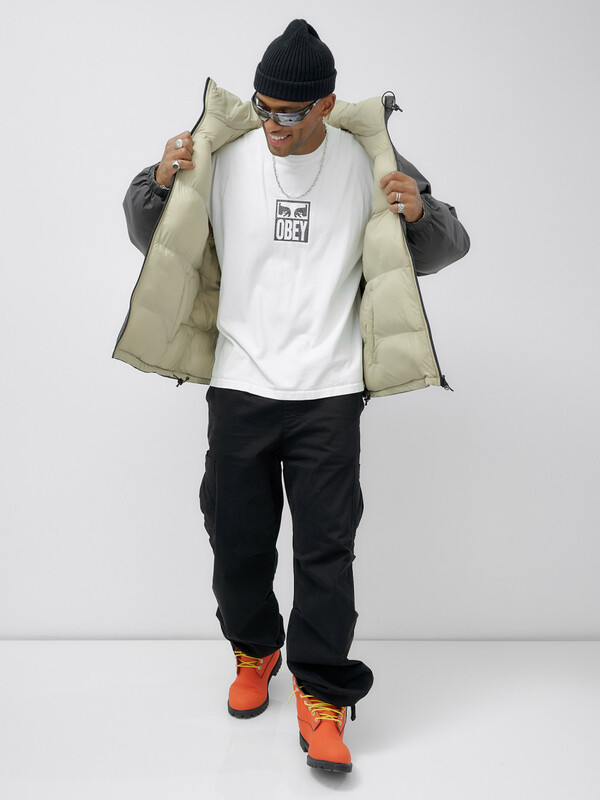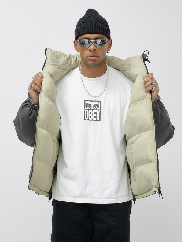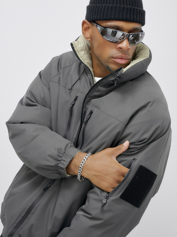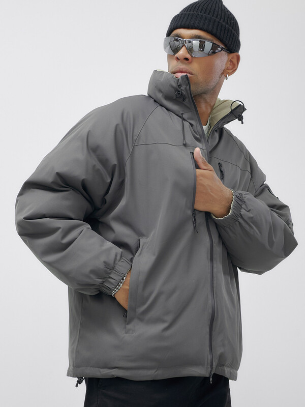 - Двусторонний дизайн: Позвольте себе разнообразие! Одна сторона куртки выполнена из плащевой ткани с стеганой фактурой, а другая — из плотной мембранной ткани, что позволяет вам менять стиль в зависимости от настроения и погодных условий.