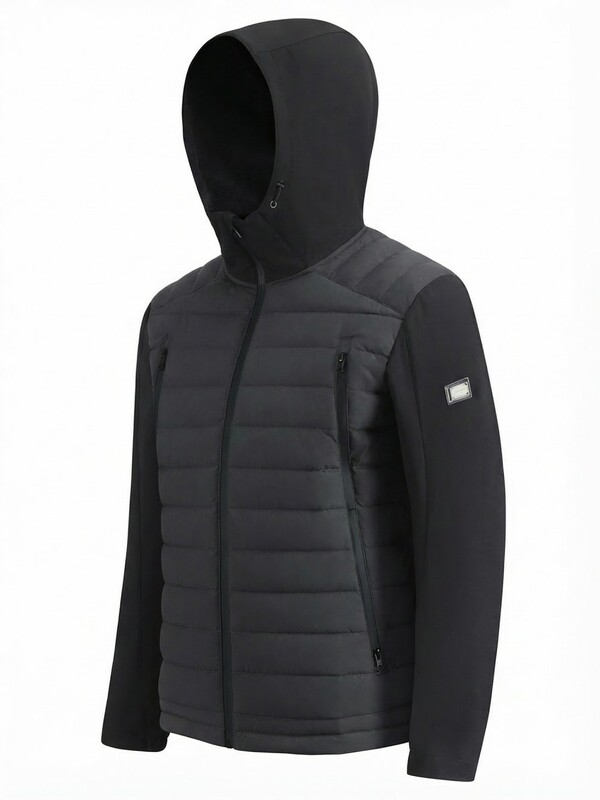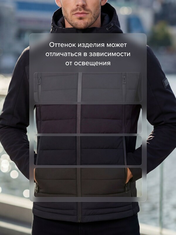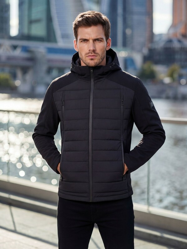 Современная мужская куртка гибридного типа сочетает в себе технологичную стёганую конструкцию и эластичные вставки из софтшелл-материала. Такая комбинация обеспечивает комфорт, свободу движения и оптимальную защиту от ветра и прохладной погоды.