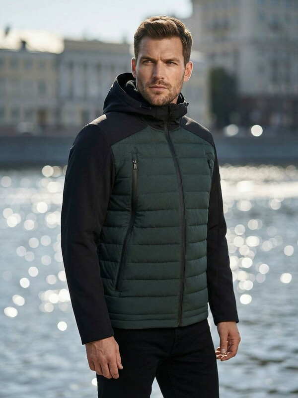 Современная мужская куртка гибридного типа сочетает в себе технологичную стёганую конструкцию и эластичные вставки из софтшелл-материала. Такая комбинация обеспечивает комфорт, свободу движения и оптимальную защиту от ветра и прохладной погоды.