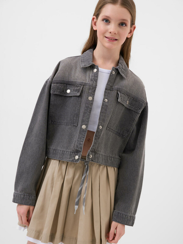 Джинсовая куртка для девочки подростка. Модель выполнена из плотного варёного денима серого цвета. Куртка свободного кроя, длина — чуть выше талии. Спереди расположены два накладных кармана на кнопках. Застежка по центру — на металлических кнопках. Рукава с манжетами на кнопках. Спинка украшена декоративной нашивкой. Низ куртки оформлен необработанным срезом с бахромой.