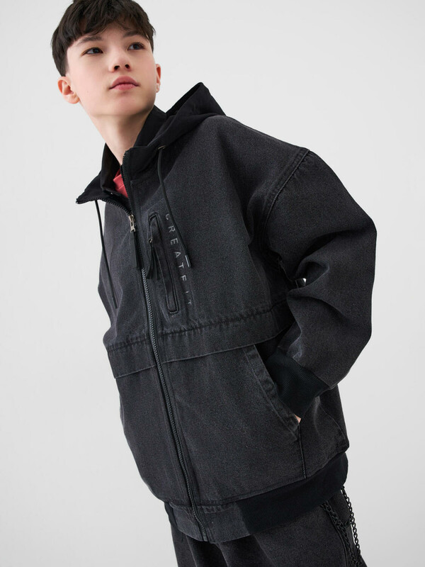 Джинсовая легкая куртка свободного кроя с удлиненным рукавом и капюшоном для мальчика подростка. Бомбер оверсайз джинсовый выполнен в графитовом оттенке с чёрными акцентами на капюшоне и манжетах. Капюшон регулируется шнурком. Спереди — застежка на молнию, два удобных кармана и вертикальный принт. На правом рукаве расположен дополнительный принт. Светоотражающие элементы на груди и спинке обеспечивают безопасность в темное время суток. Куртка выглядит современно и подходит для повседневного городского образа.