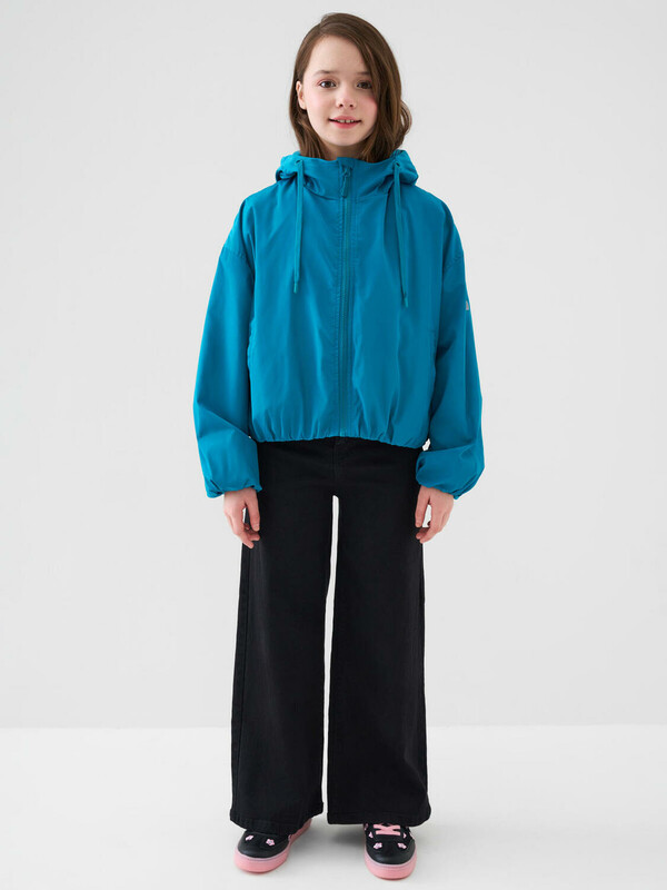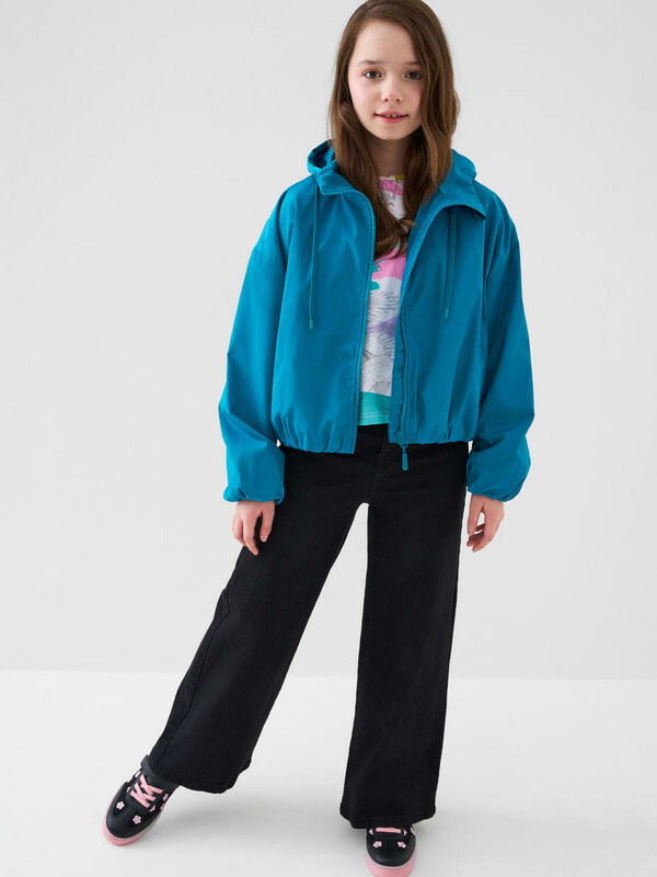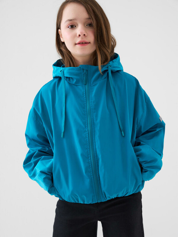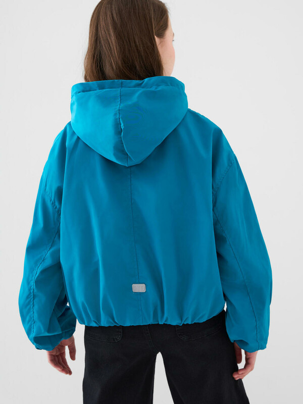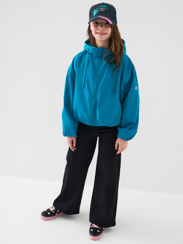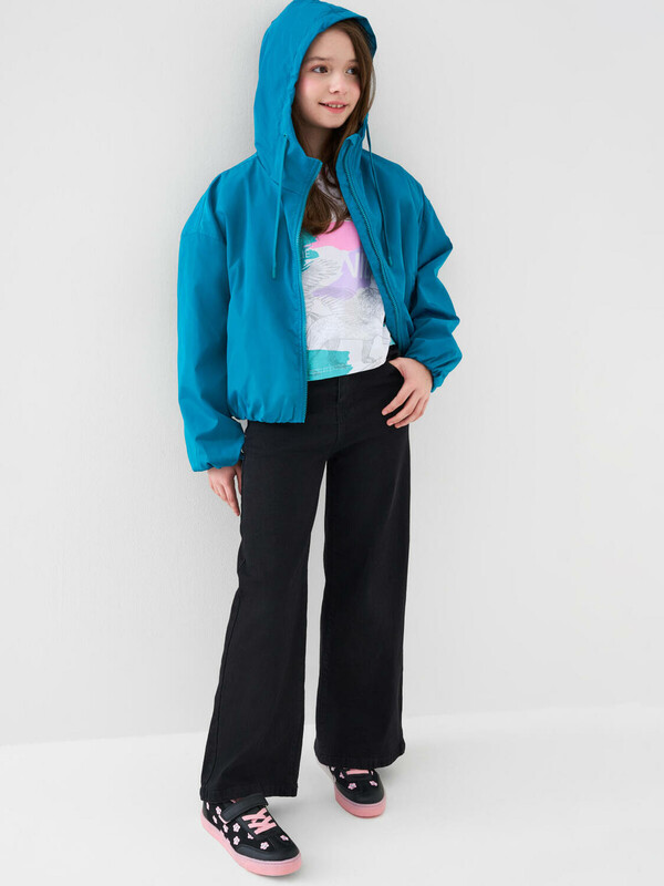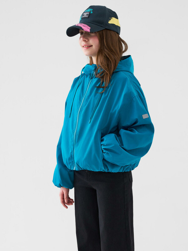 Ветровка оверсайз для девочки подростка. Температурный режим от +20С до +10С. Ткань с ветрозащитным и водоотталкивающим покрытием. Внутри гладкая подкладка. Капюшон несъемный, регулируется шнуром. Спереди расположены два кармана на молнии. По низу и на манжетах — мягкие резинки для комфортной посадки. Сзади и на рукаве есть светоотражающие ярлычки для безопасности в темное время суток.