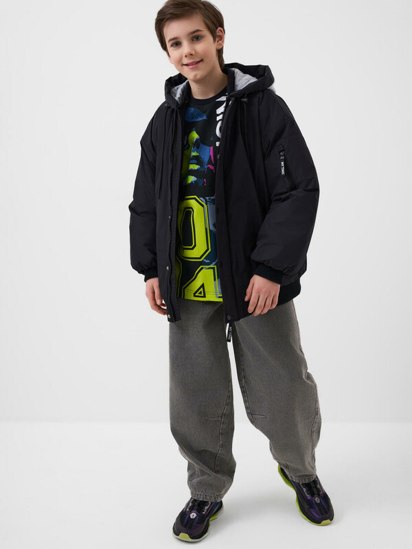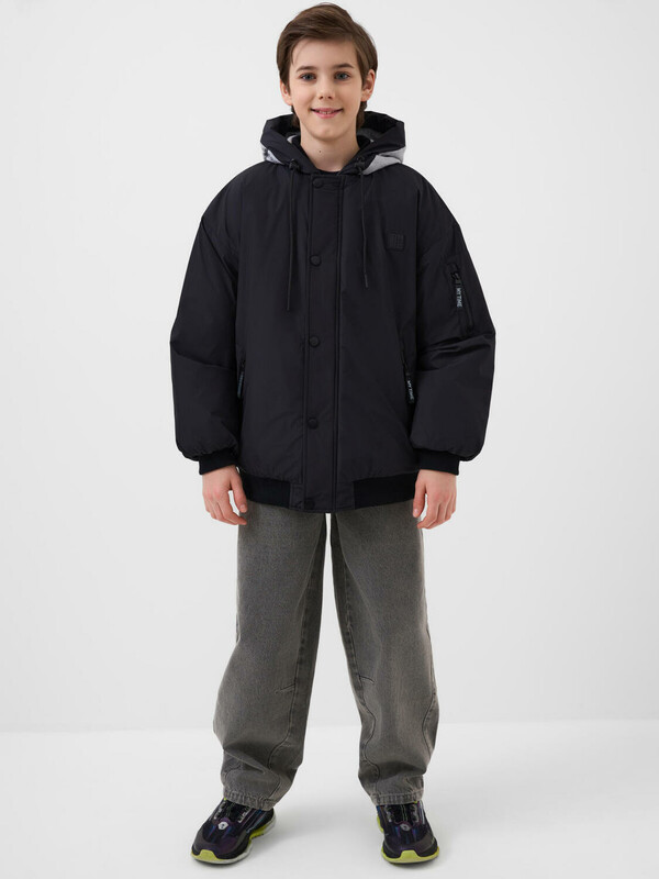 Лёгкая оверсайз куртка, выполненная в спортивном стиле для мальчика подростка. Температурный режим от +15°C до 0°C. Гладкая подкладка. Свободный крой и длину до бёдер. Застёжка на кнопках. Капюшон со шнуром для регулировки. На груди — чёрная резиновая нашивка. На рукаве и по бокам расположены карманы на молнии. Внутренний карман на липучке. На спинке — светоотражающая нашивка для безопасности в ночное время суток. Манжеты и нижний край выполнены из риба, что обеспечивает комфортную посадку.