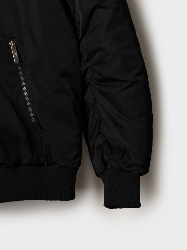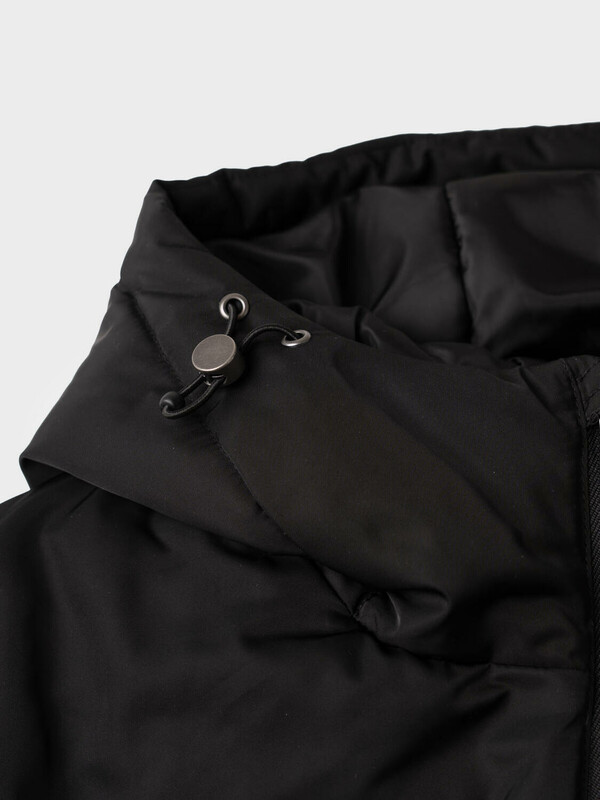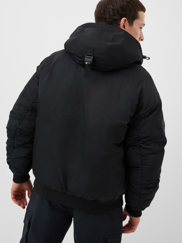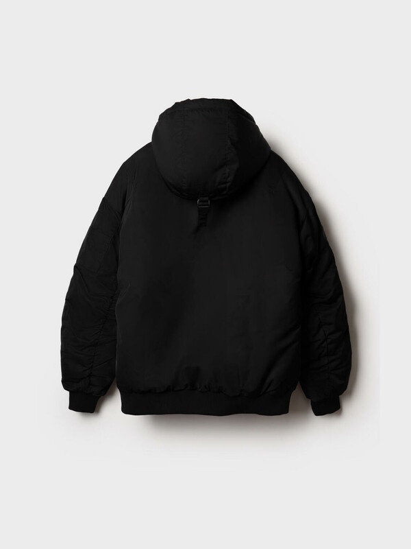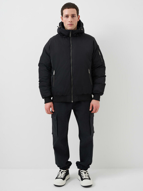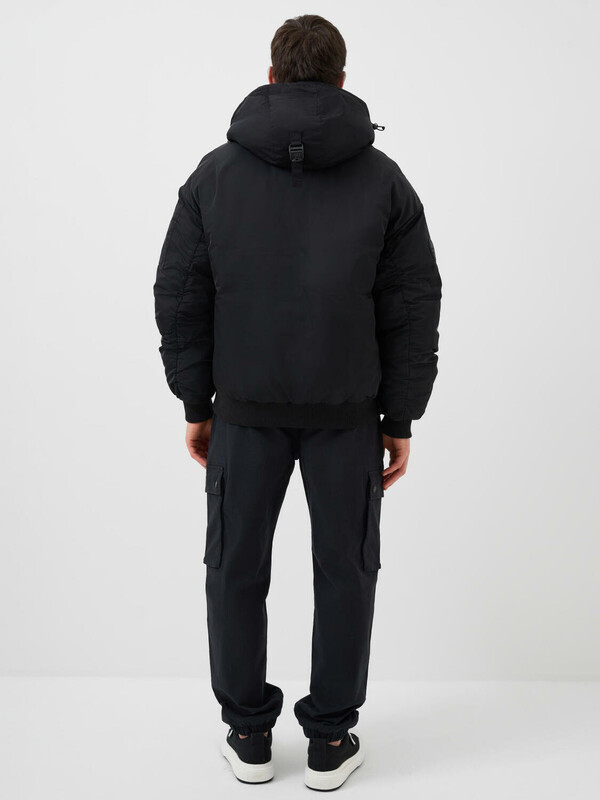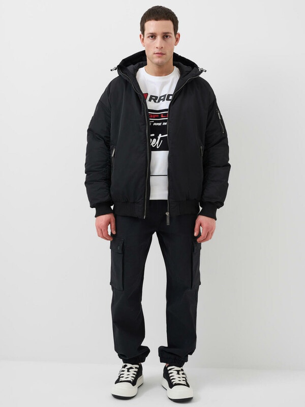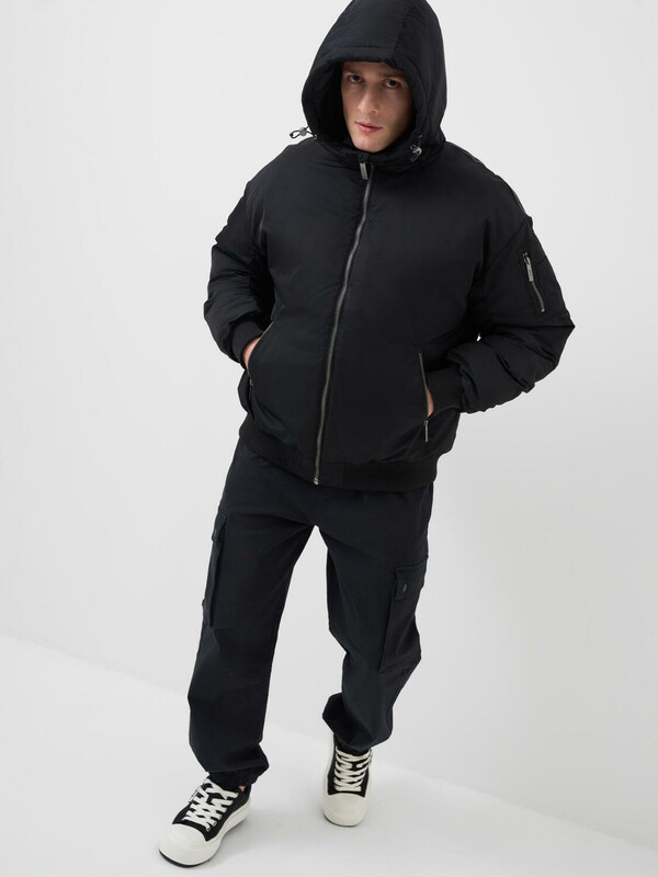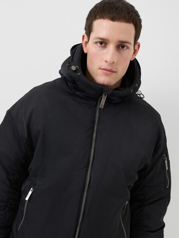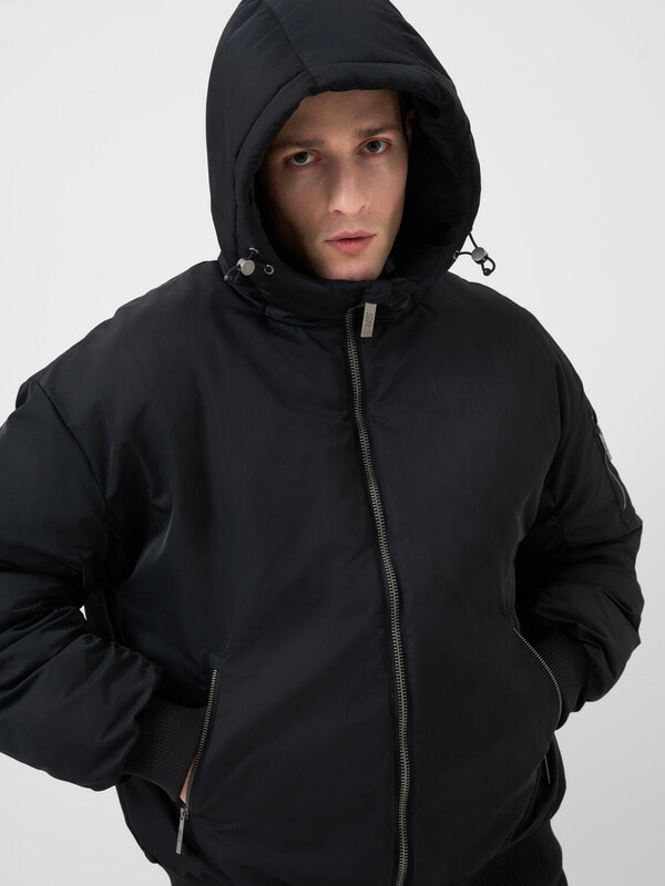 Мужская демисезонная куртка оверсайз. Температурный режим от +15С до 0С. Ткань с ветрозащитным и водоотталкивающим покрытием. Внутри гладкая подкладка. Капюшон регулируется с помощью шнура со стопперами и украшен металлической пряжкой сзади. Два боковых кармана на молнии и карман на рукаве. На левом рукаве — декоративный силиконовый шеврон. Манжеты и низ куртки обработаны эластичным рибом.