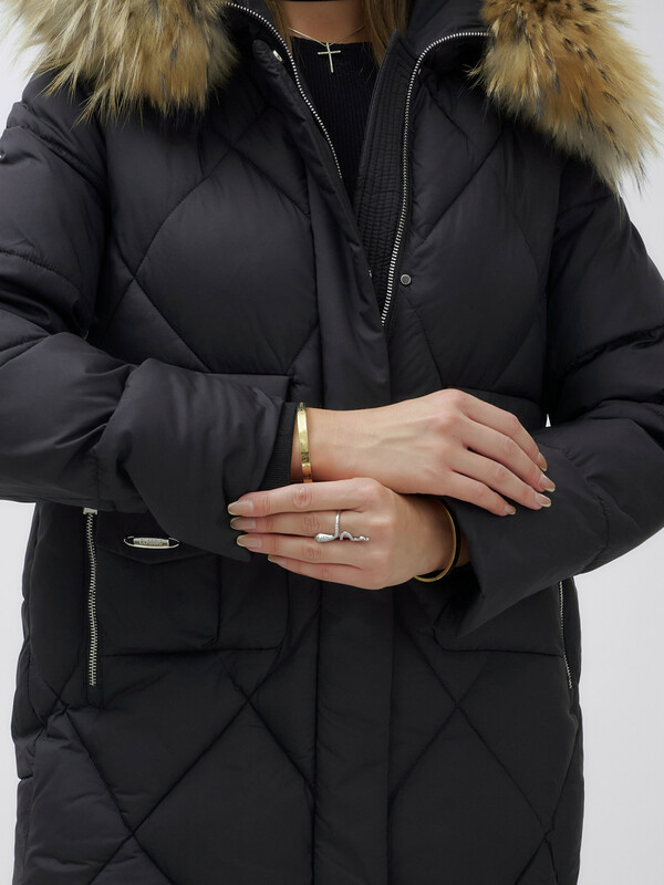 - Несъемный капюшон с натуральной съемной опушкой добавляет изысканности и защищает от непогоды. Мех енота добавляет шик и блеск вашему образу.