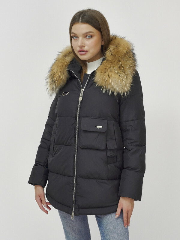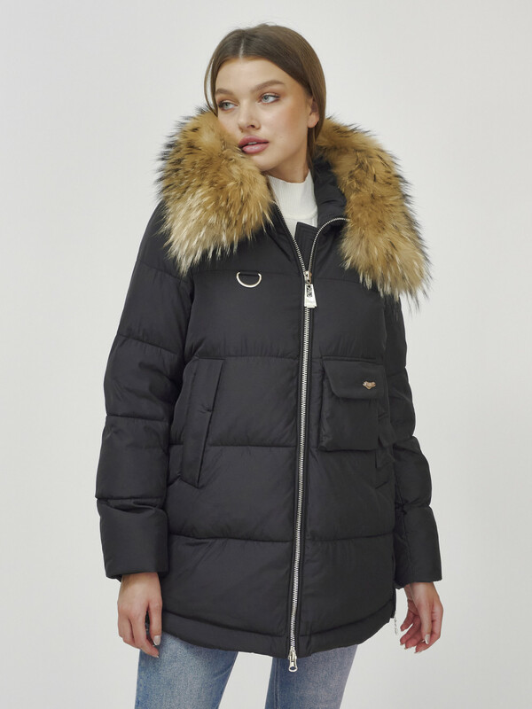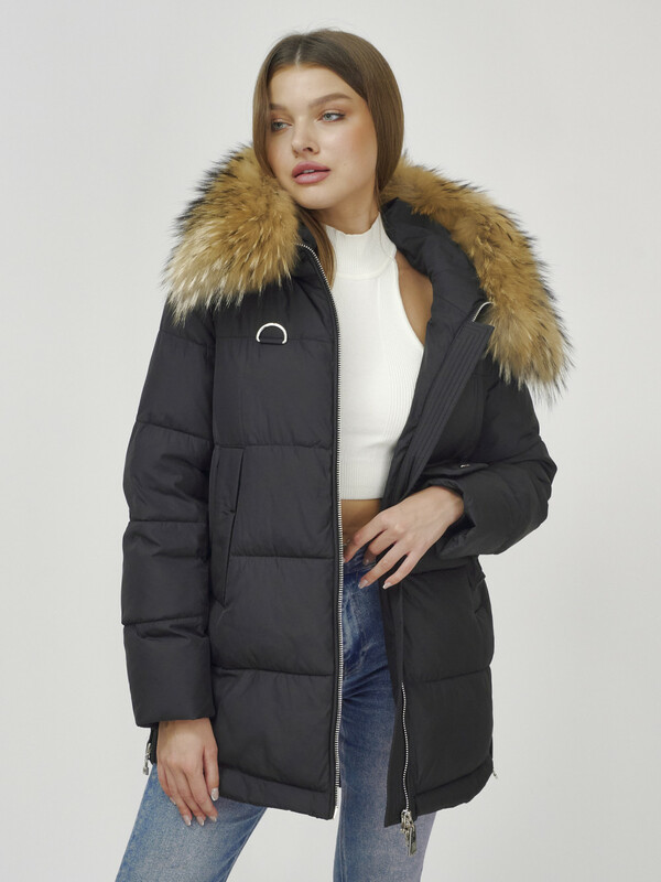 Куртка женская зимняя с мехом енот премиум класса черного цвета 3146Ch