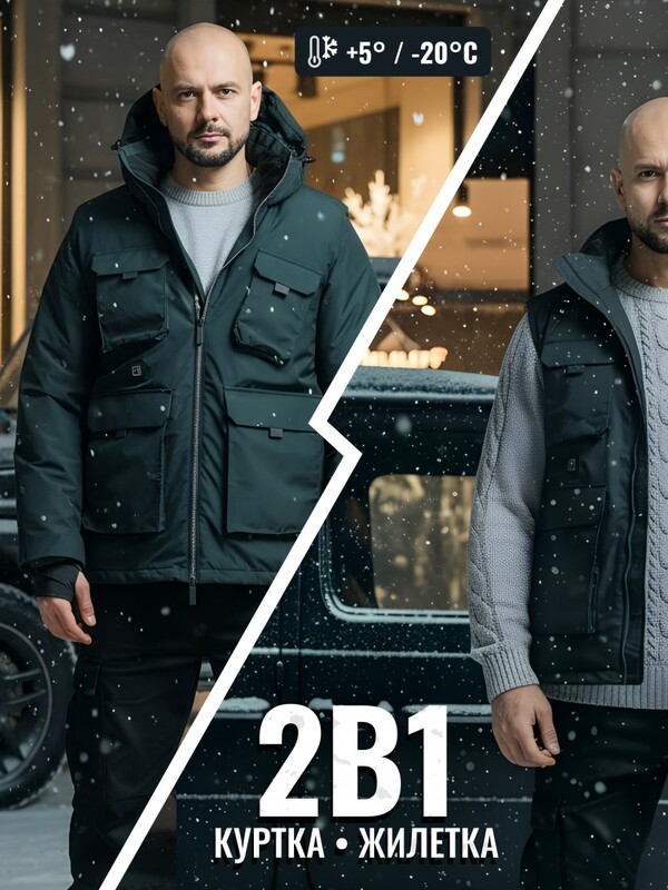 Трансформер 2 в 1. Куртка-жилетка с подогревом – это современная одежда, которая обеспечивает дополнительную защиту от холода и сохраняет тепло в течение длительного времени. Куртка 2 в 1 идеально подходит для тех, кто проводит много времени на открытом воздухе или занимается активными видами спорта в холодные времена года. Куртка с подогревом – это одежда, способная сохранять тепло и защищать от холода. Куртка сочетает в себе комбинацию из двух изделий куртки и жилетки. Съемные рукава позволяют меняться изделию по Вашему усмотрению. Куртка влагостойкая и ветрозащитная. Заряжается от пауэрбанка и имеет специальный нагревательный элемент, который работает на основе термоэлектрической подкладки. Кнопка включения находится у правого кармана. Пауэрбанк подключается внутри. Это позволяет сохранять тепло внутри куртки и предотвращать его выход наружу. Куртка с подогревом удобна и функциональна, с накладными карманами для хранения вещей, регулируемым съемным капюшоном и манжетами, чтобы помочь вам подстроиться под погоду. Она также водонепроницаемая и ветрозащитная, чтобы обеспечить вам дополнительную защиту от непогоды. Одна из особенностей куртки с подогревом – это возможность ее использования с помощью аккумулятора или пауэрбанка. Это позволяет вам не зависеть от розетки и использовать куртку в любом месте и в любое время. Аккумуляторы обычно имеют различную емкость и время работы, поэтому вы можете выбрать подходящий вариант для себя. Куртка с подогревом также может быть стильным аксессуаром, который поможет вам выглядеть модно и трендово. В целом, жилет с подогревом – это отличное решение для тех, кто хочет быть защищенным от холода и сохранять комфортную температуру в любых погодных условиях. Она сочетает в себе функциональность, стиль и инновационные технологии, делая ее идеальным выбором для активного образа жизни и повседневного использования. Желаем Вам позитива и крепкого здоровья. Уверены, Вы по достоинству оцените высокое качество нашей продукции.