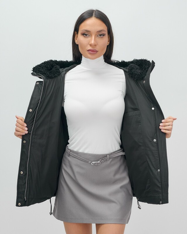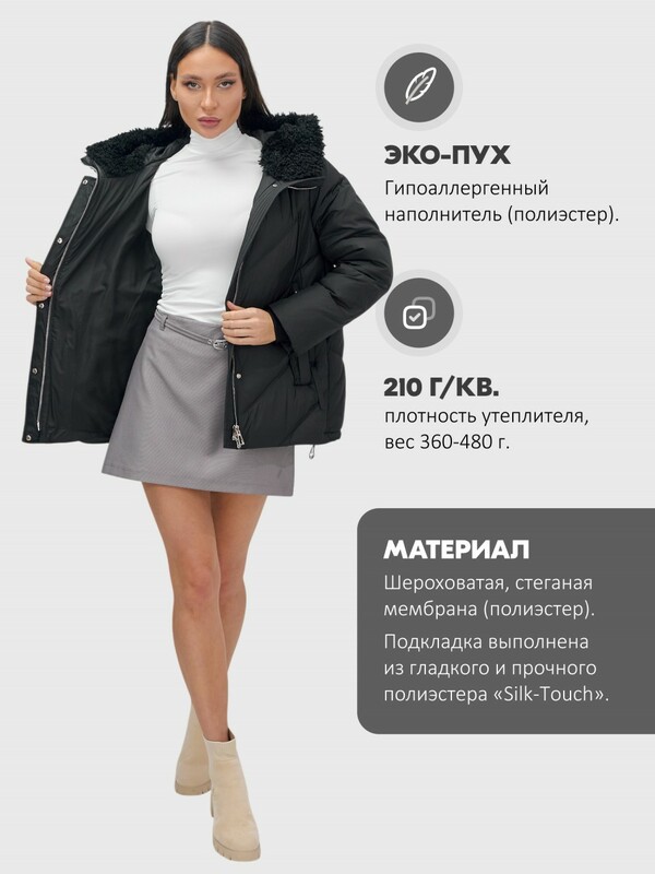 Особенность этой модели — несъёмный мех, который придаёт куртке изысканность и дополнительное тепло. Внутренняя подкладка из полиэстера и искусственной овчины не только согревает, но и дарит комфорт на весь день.