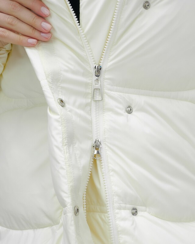 Куртка обладает средней длиной до бедра, прямым и свободным кроем, длинными рукавами с манжетами и не съемным капюшоном. Внутренние швы проклеены и прошиты для дополнительной защиты от ветра. Внутренние карманы и прорезные карманы на молнии обеспечивают удобное хранение вещей.