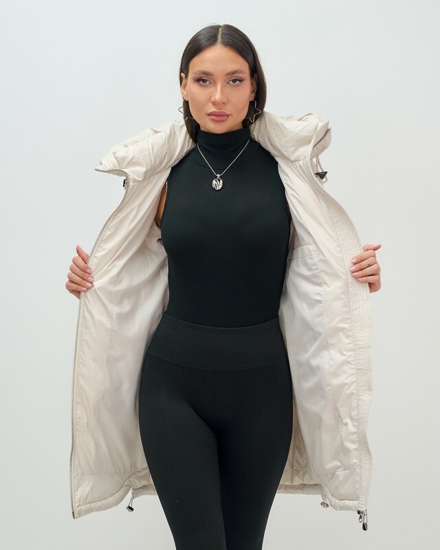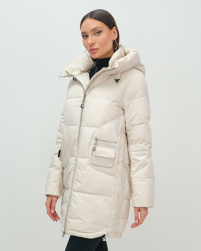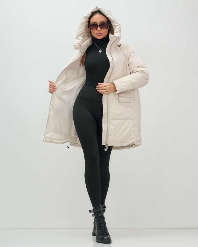 Куртка имеет прямой и свободный покрой, длину до колена и длинные рукава с манжетами, что обеспечивает комфорт и свободу движений. Съемный воротник/стойка и фиксатор на капюшоне добавляют элегантности и удобства, а внутренние карманы обеспечивают дополнительное место для мелочей.