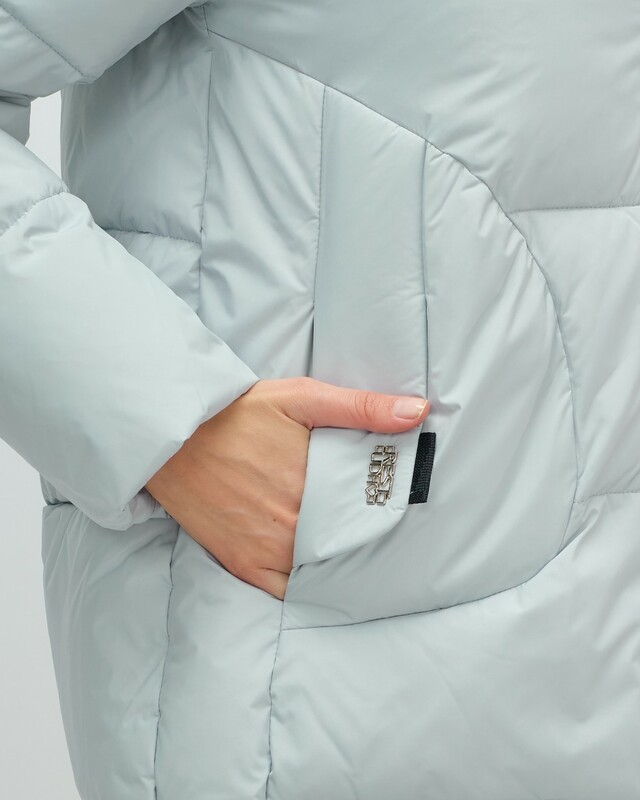 Куртка имеет прямой и свободный покрой, длину до колена и длинные рукава с манжетами, что обеспечивает комфорт и свободу движений. Съемный воротник/стойка и фиксатор на капюшоне добавляют элегантности и удобства, а внутренние карманы обеспечивают дополнительное место для мелочей.