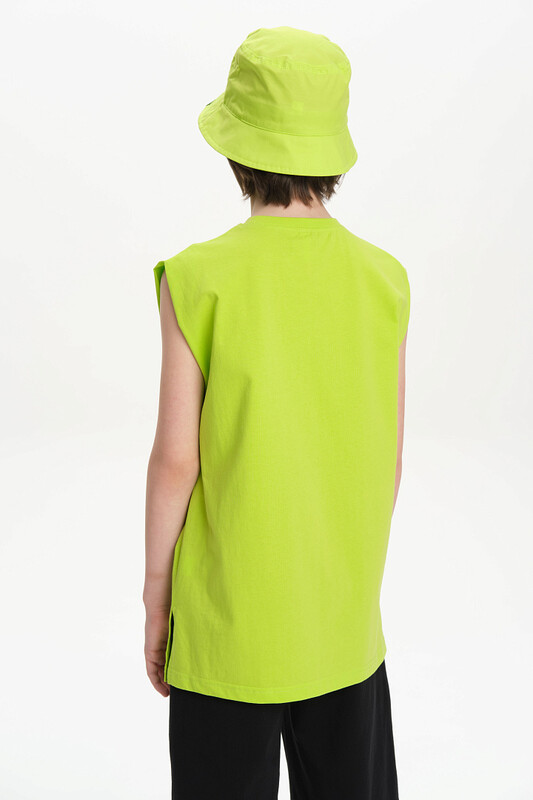 Летняя майка для мальчика свободного силуэта. Выполнена из 100% хлопка. Горловина из рибаны - голова не застрянет. По переду украшена ярким принтом с персонажем из игры Pac-man (пакмен) с надписями. Перевод надписей: "let's be creative" - будь креативный, "think bold" - думай смелее, "enjoy" - наслаждайся, "have fun" - веселись. Футболка без рукавов отлично подойдет для занятий спортом, походов на пляж и прогулок.