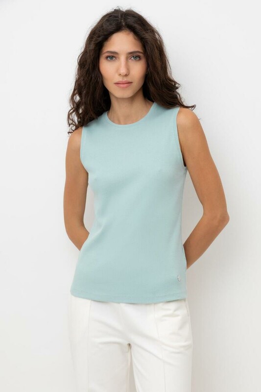 Базовым элементом гардероба является топ из эластичного трикотажа в рубчик. Широкое плечо и высокий вырез делают изделие комфортным и универсальным в носке.