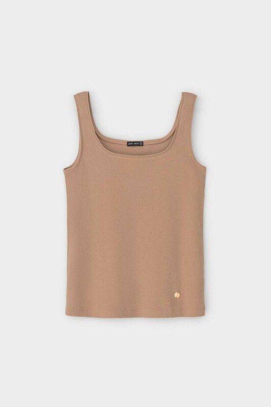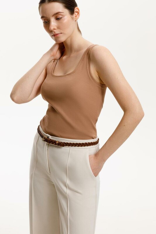 Классическим элементом гардероба является базовый топ в рубчик. Узкие бретели и глубокий вырез делают изделие комфортным в носке и универсальным в повседневной жизни.