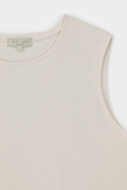 Базовым элементом гардероба является топ из эластичного трикотажа в рубчик. Широкое плечо и высокий вырез делают изделие комфортным и универсальным в носке.