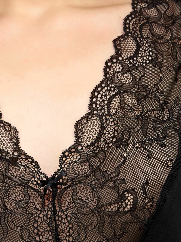 Майка полуприлегающего силуэта с V-образным вырезом. Выполнена из трикотажного полотна кулирного переплетения, а зона декольте – из полупрозрачного кружева. Длина – до середины бедра.