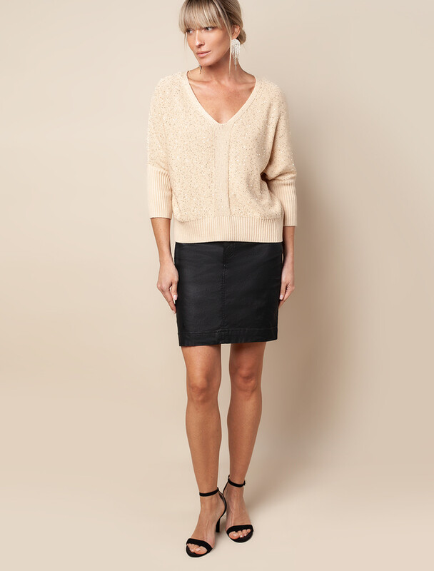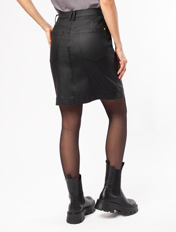Мини-юбка выполнена из денима с покрытием под кожу. Мягкий и эластичный материал с внутренней тканевой поверхностью обеспечит исключительный комфорт, как вторая кожа. Совет стилиста: прямая мини-юбка хороша в тандеме с любым объемным верхом; рубашка, свитшот или вязаный джемпер. В классическом сочетании – водолазка или свитер мелкой вязки.