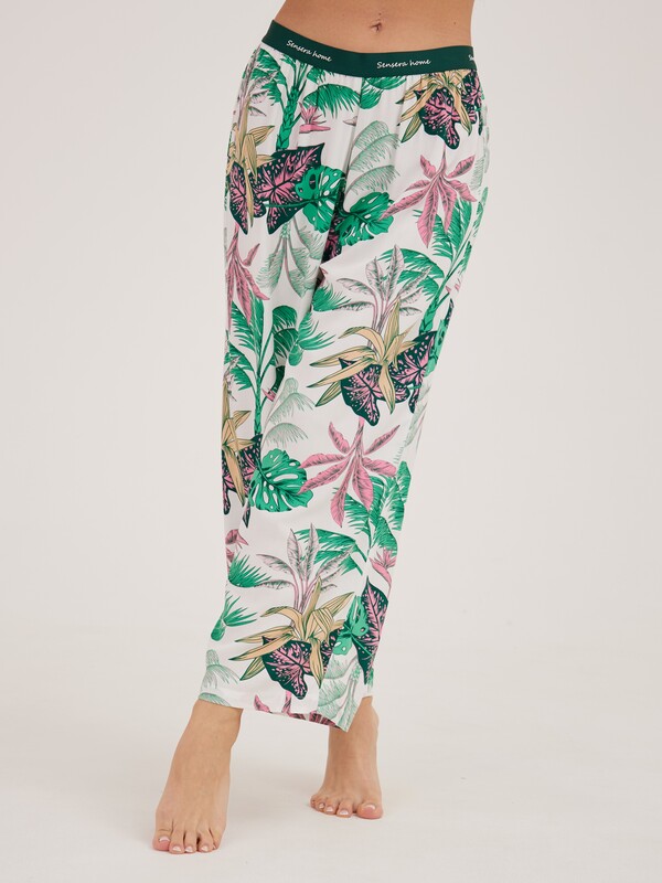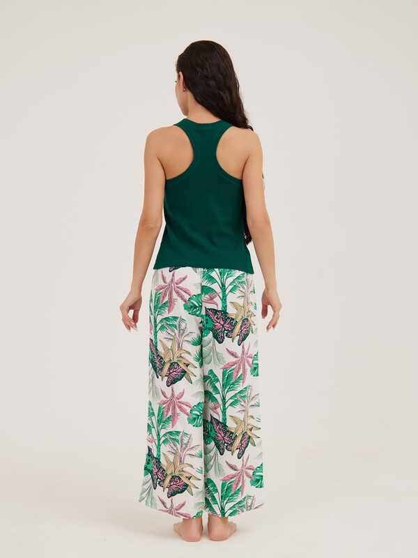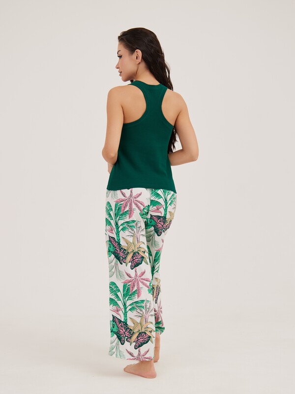 Домашний костюм состоит из майки зеленого цвета и принтованных брюк. Майка-боксерка выполнена из рибового трикотажного полотна. Брюки на трикотажной резинке и надписью Sensera выполнены из принтованной тканной вискозы.