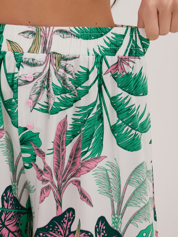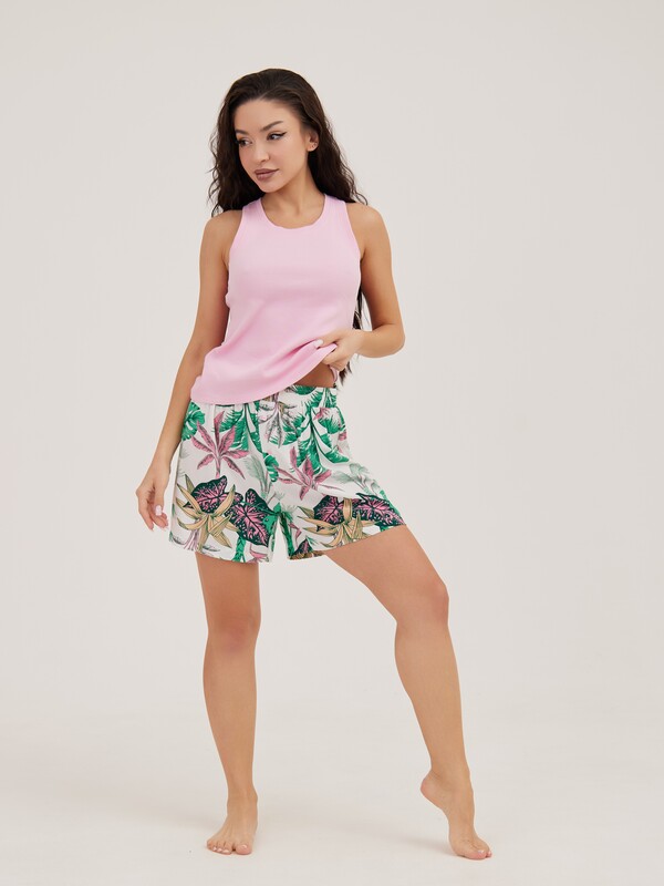 Пижама состоит из майки и шорт. Майка-боксерка выполнена из рибового трикотажного полотна нежно розового цвета. Широкие шорты выполнены из тканой принтованной вискозы. Шорты на широкой резинке. В качестве отделки - имитация гульфика и розовые пуговички.