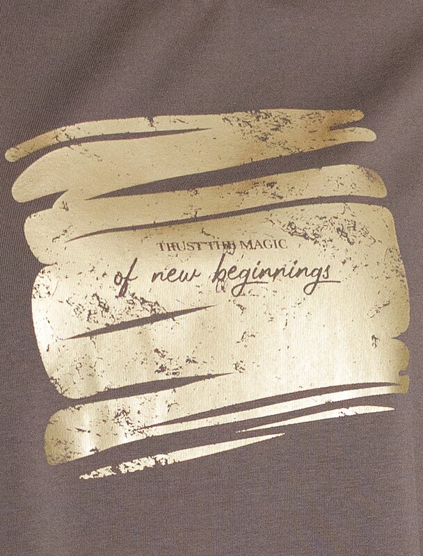 Стильная базовая футболка черного цвета с серебристым принтом фольгой выполнена из плотного хлопка с эластаном для комфортной посадки на любую фигуру.  Прямая футболка классического кроя с круглым вырезом, прекрасно подходит для разных типов фигуры, в том числе и на большие размеры. Мягкость хлопка вместе с небольшой долей эластана гарантирует идеальную посадку и свободу движений. Легкая натуральная дышащая ткань премиального качества делает футболку с коротким рукавом идеальным вариантом для повседневной носки дома, на работу или офис. Однотонная футболка дополнена авторским аккуратным принтом с минималистичной надписью, который придает праздничный и элегантный вид без лишней вычурности. Блестящий принт аккуратно украшает, добавляя изысканный акцент и создавая легкий мерцающий эффект. Перевод надписи Trust the magic of new beginnings -  Дооверьтесь магии новых начинаний.